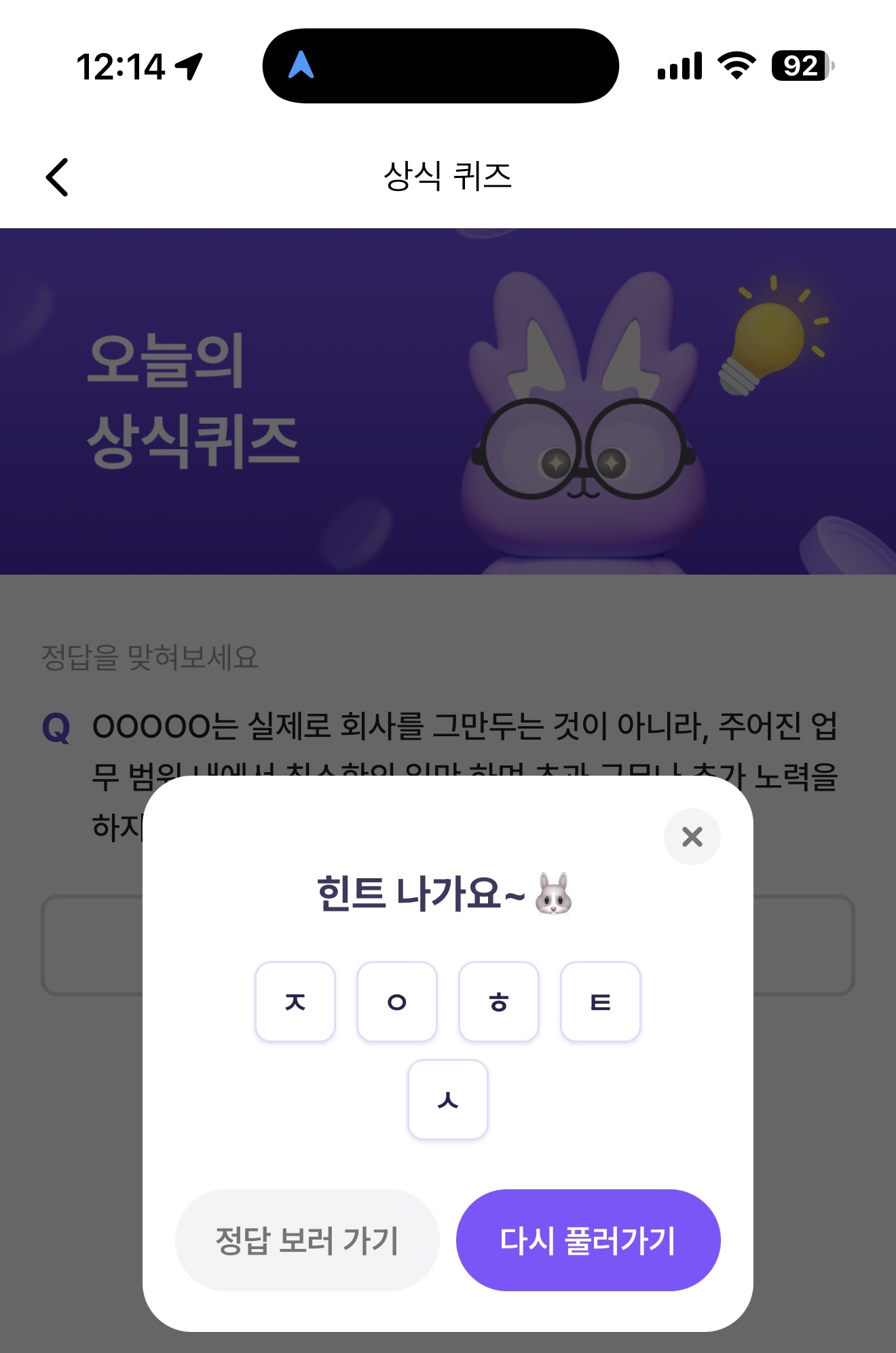 OOOOO는 실제로 회사를 그만두는 것이 아니라, 주어진 업무 범위 내에서 최소한의 일만 하며 초과 근무나 추가 노력을 하지 않는 새로운 직장인의 태도를 의미해요. 주관식 퀴즈인데요.