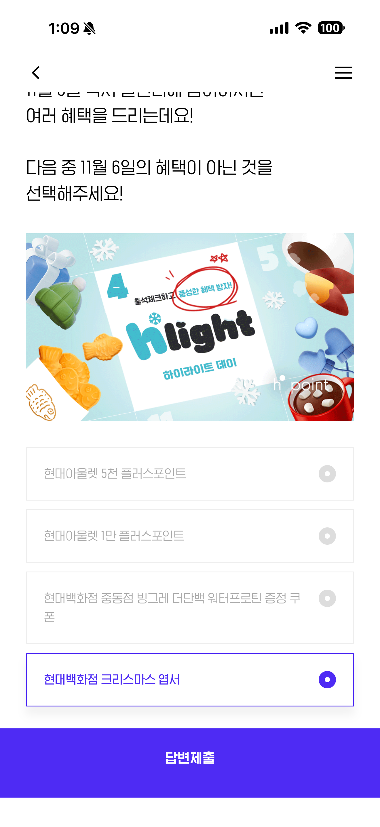 11월의 하이라이트! 하이라이트 캘린더에 출석하시면 매일 새로운 혜택이 쏟아집니다! 11월 6일 역시 캘린더에 참여하시면 여러 혜택을 드리는데요! 다음 중 11월 6일의 혜택이 아닌 것을 선택해주세요! 보기는 1. 현대아울렛 5천 플러스포인트 2. 현대아울렛 1만 플러스포인트