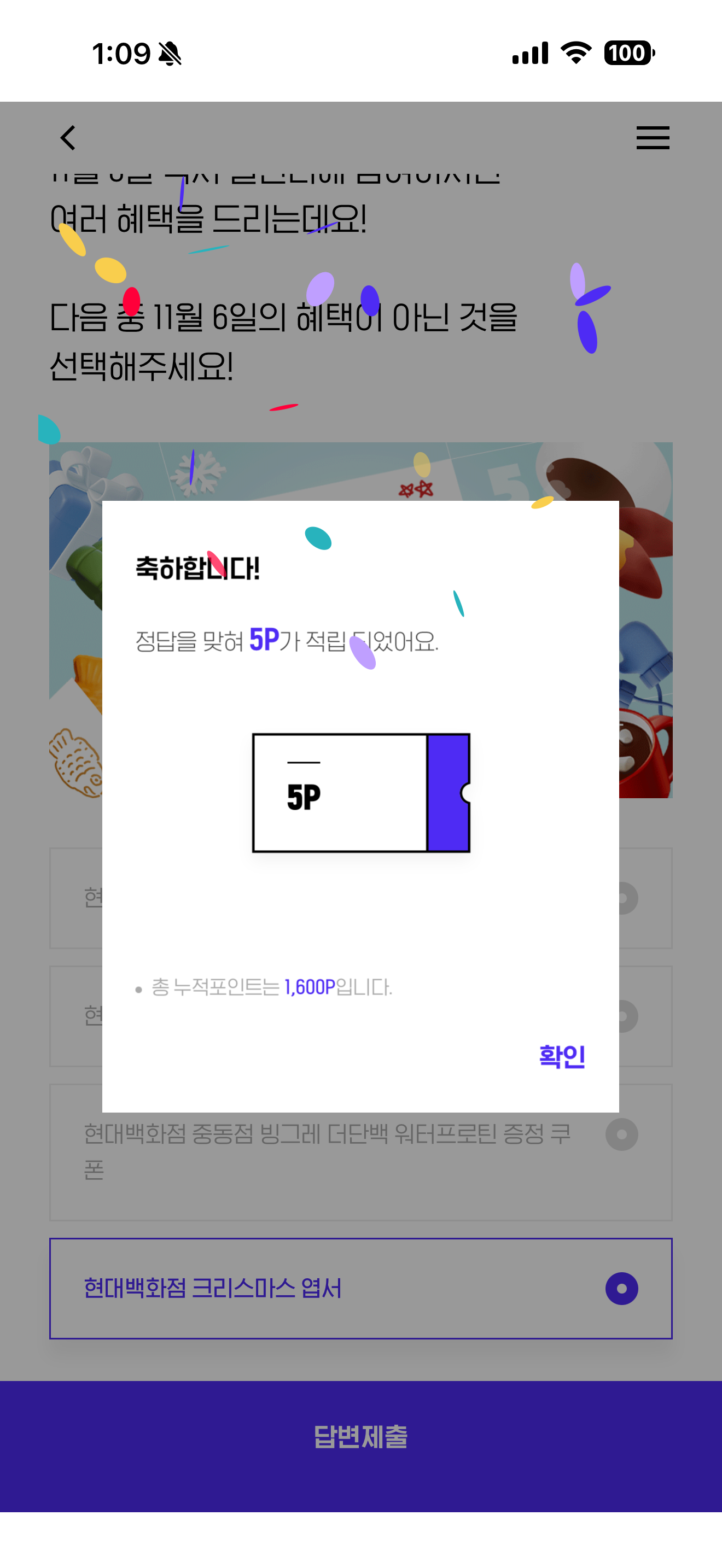 H포인트 퀴즈 정답은 현대백화점 크리스마스 엽서 입니다