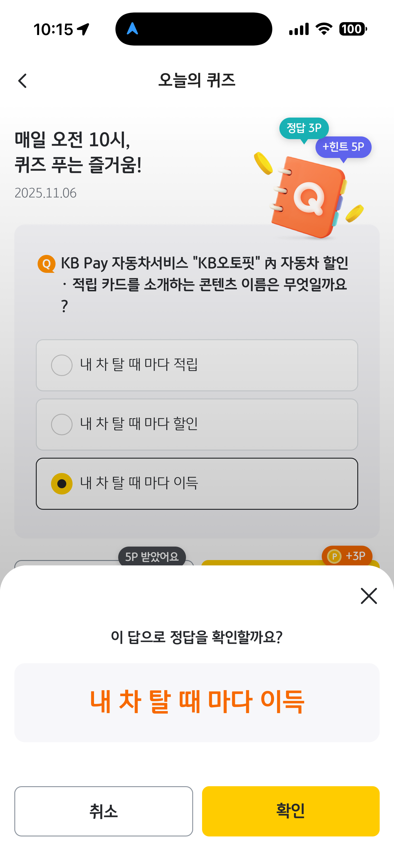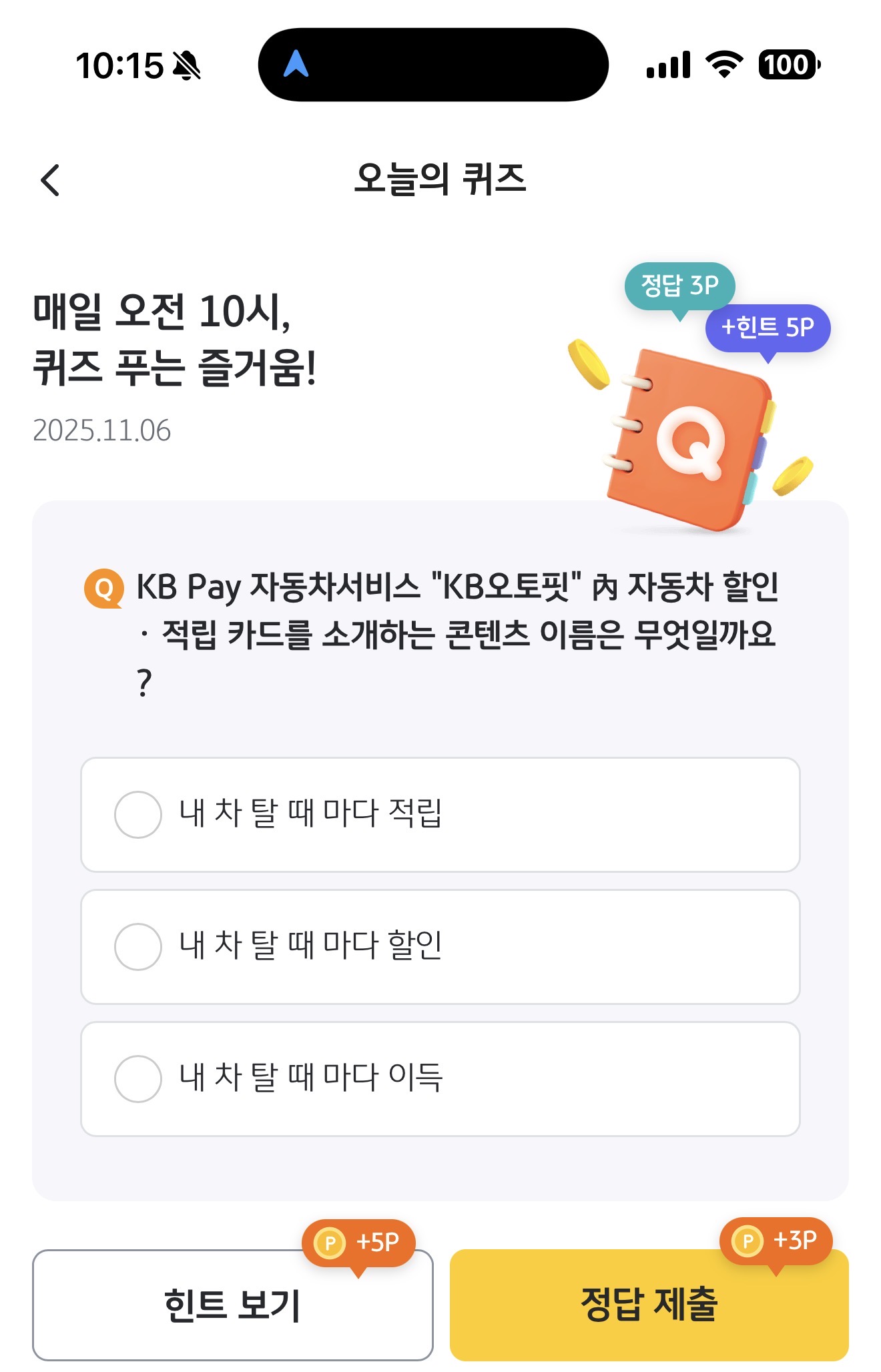 KB pay 오늘의 퀴즈 정답은 내 차 탈 때 마다 이득 입니다
