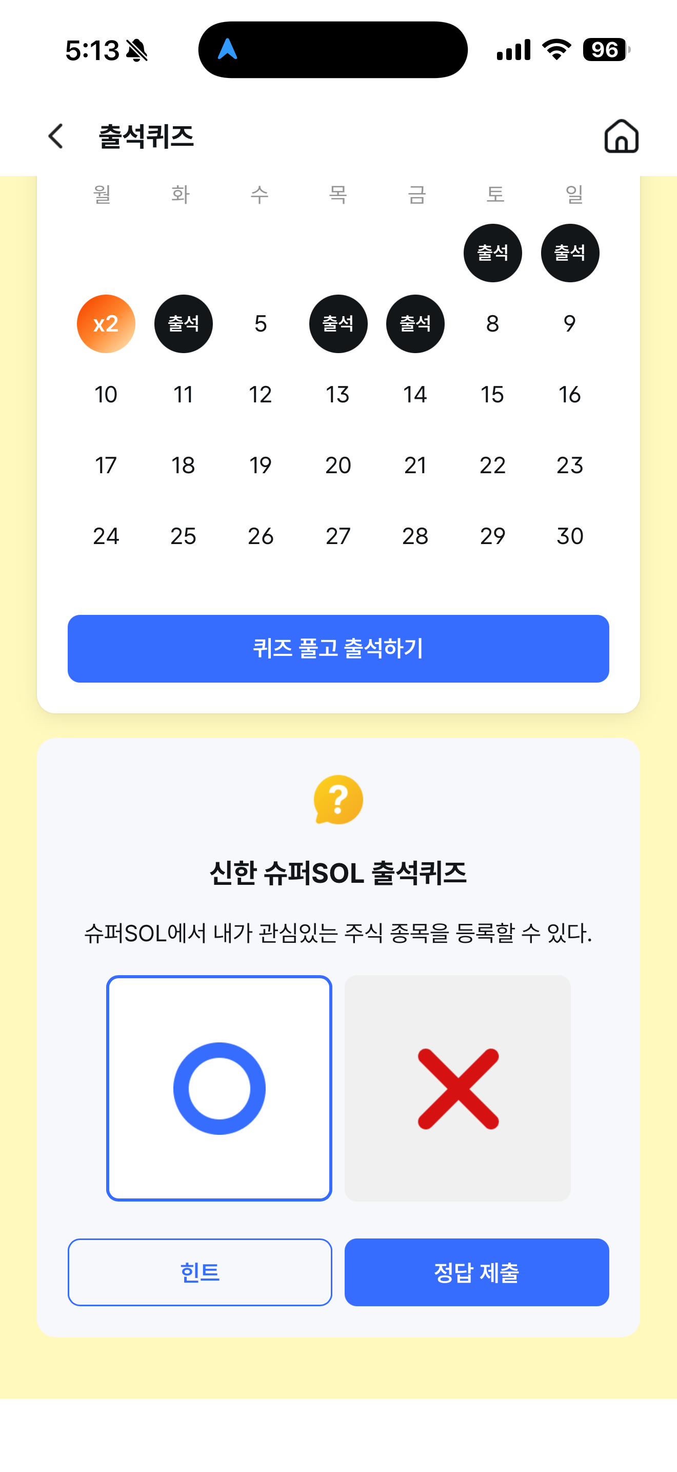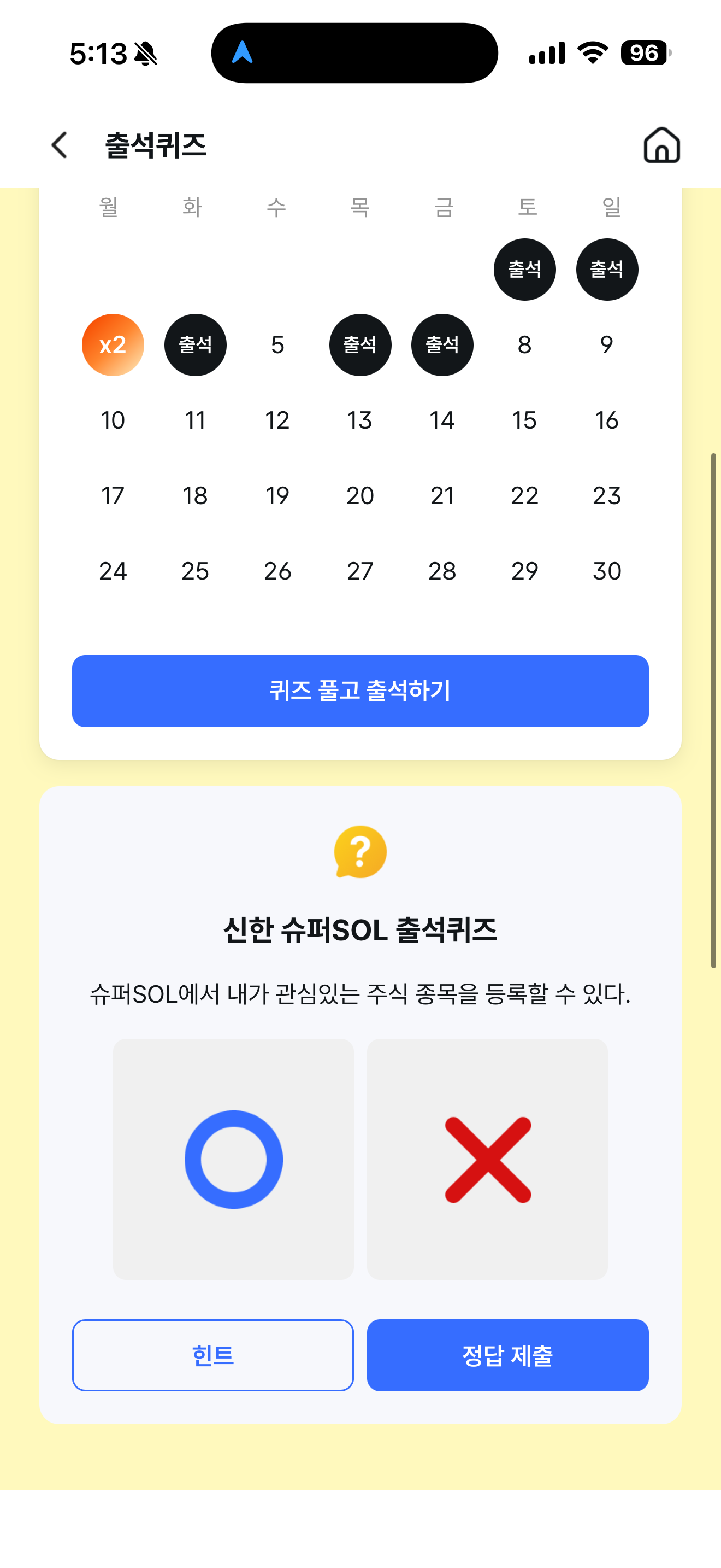 신한 슈퍼SOL 출석퀴즈 정답은 O 입니다