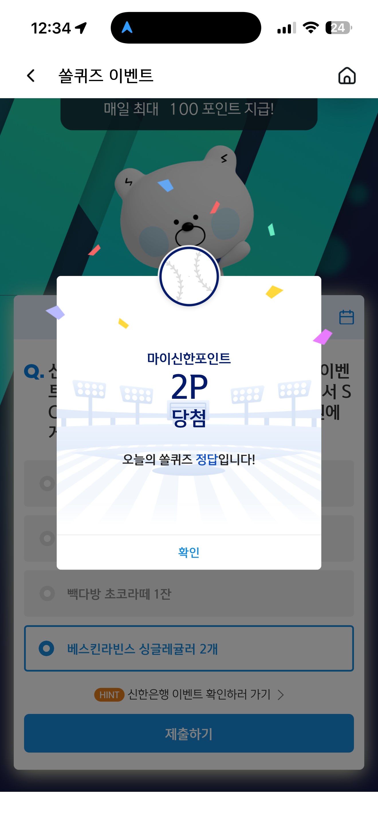 신한 슈퍼SOL 야구/상식 쏠퀴즈 정답은 베스킨라빈스 싱글레귤러 2개 입니다
