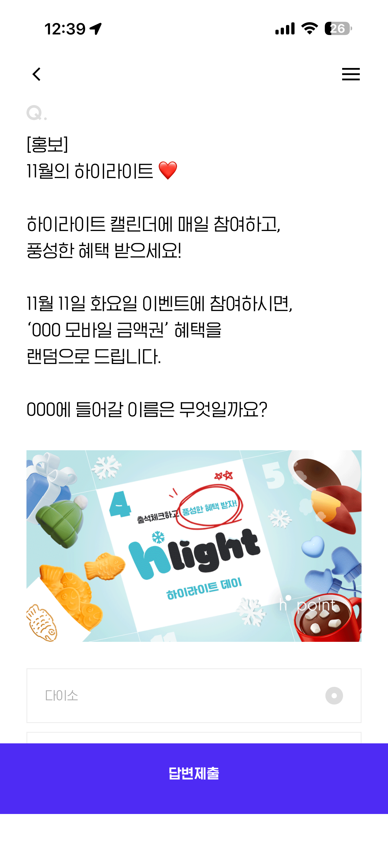 H포인트 퀴즈 정답은 다이소 입니다