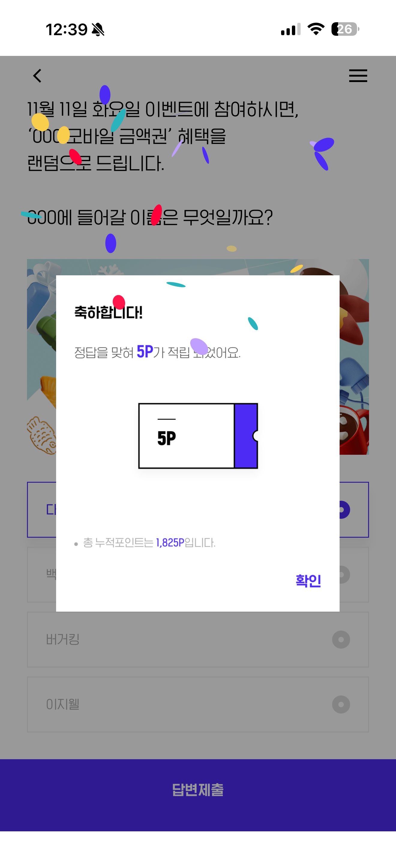 11월의 하이라이트 하이라이트 캘린더에 매일 참여하고, 풍성한 헤택 받으세요! 11월 11일 화요일 이벤트에 참여하시면, '000 모바일 금액권' 혜택을 랜덤으로 드립니다. 000에 들어갈 이름은 무엇일까요? 보기는 1. 다이소 2. 백미당 3. 버거킹 4. 이지웰 입니다
