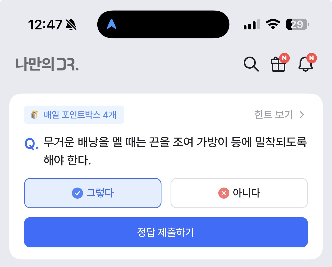 무거운 배낭을 멜 때는 끈을 조여 가방이 등에 밀착되도록 해야 한다. 그렇다 아니다 선택하면 되는데요. 무거운 배낭을 멜 때는 어떻게 메야 할까요? 어깨에 무게가 최소화 할 수 있도록 해야겠죠