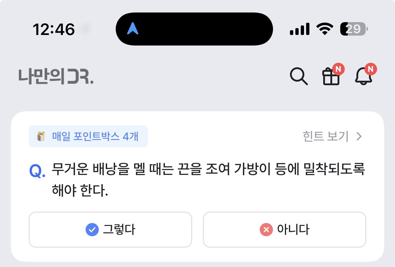 나만의 닥터 퀴즈 11월 10일 정답(무거운 배낭을 멜 때는 끈을 조여 가방이 등에 밀착되도록 해야 한다)