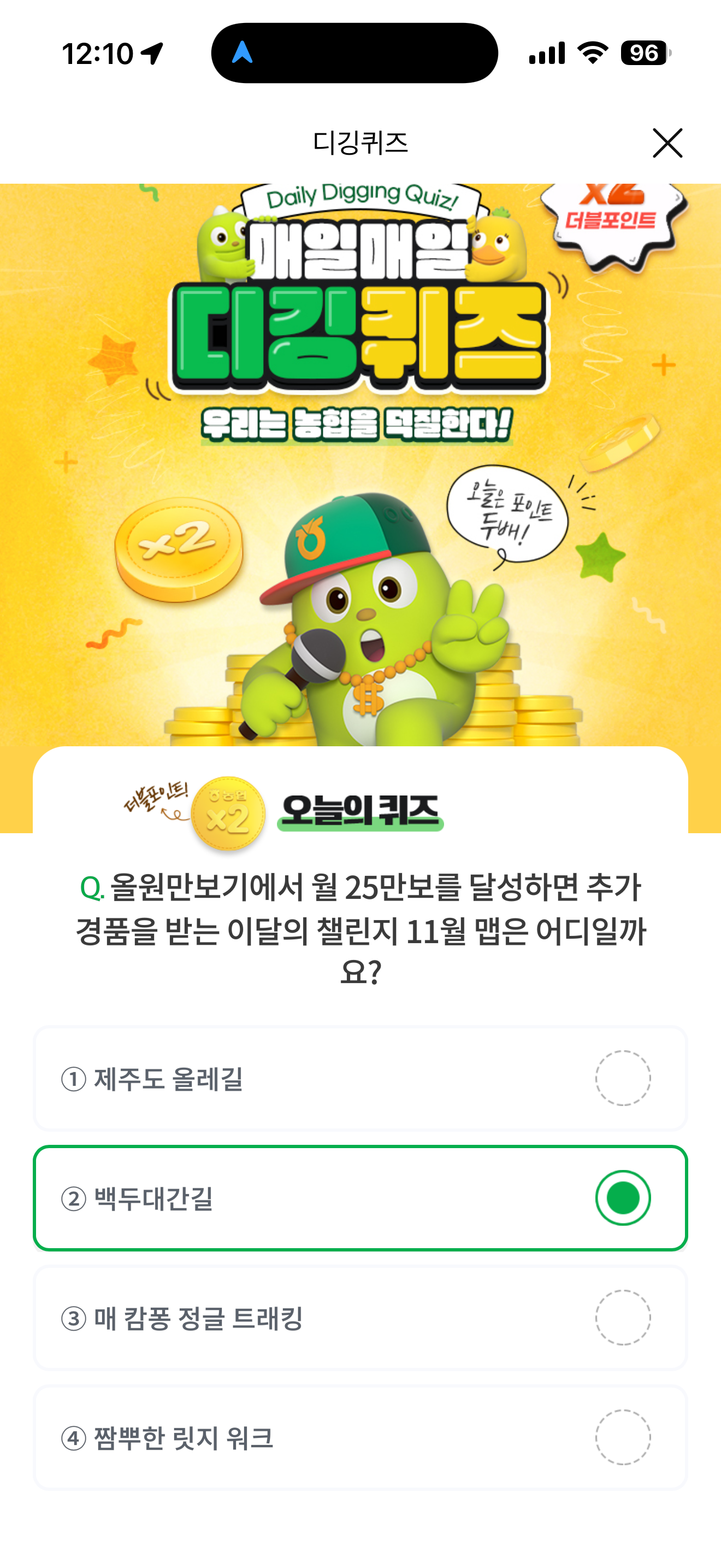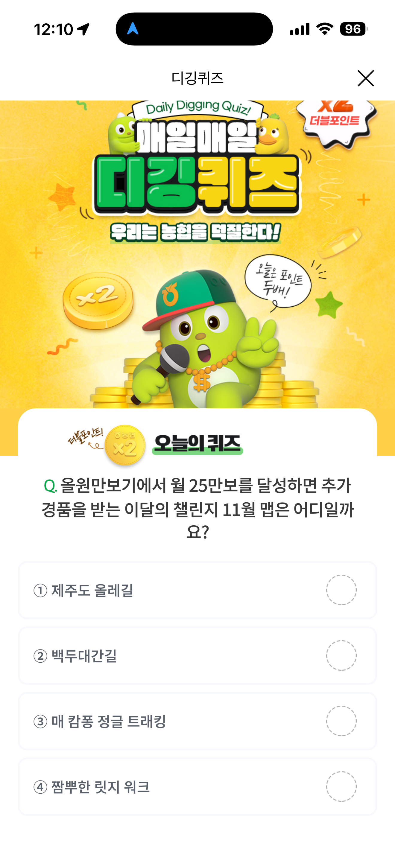 NH올원뱅크 디깅퀴즈 11월 12일 정답(올원만보기에서 월 25만보를 달성하면 추가 경품을 받는 이달의 챌린지 11월 맵은 어디일까요?)