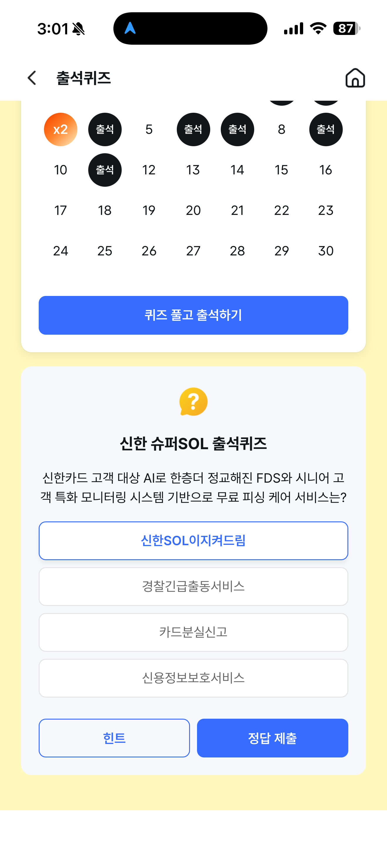 신한 슈퍼SOL 출석퀴즈 11월 12일 정답(신한카드 고객 대상 AI로 한층더 정교해진 FDS와 시니어 고객 특화 모니터링 시스템 기반으로 무료 피싱 케어 서비스는?)