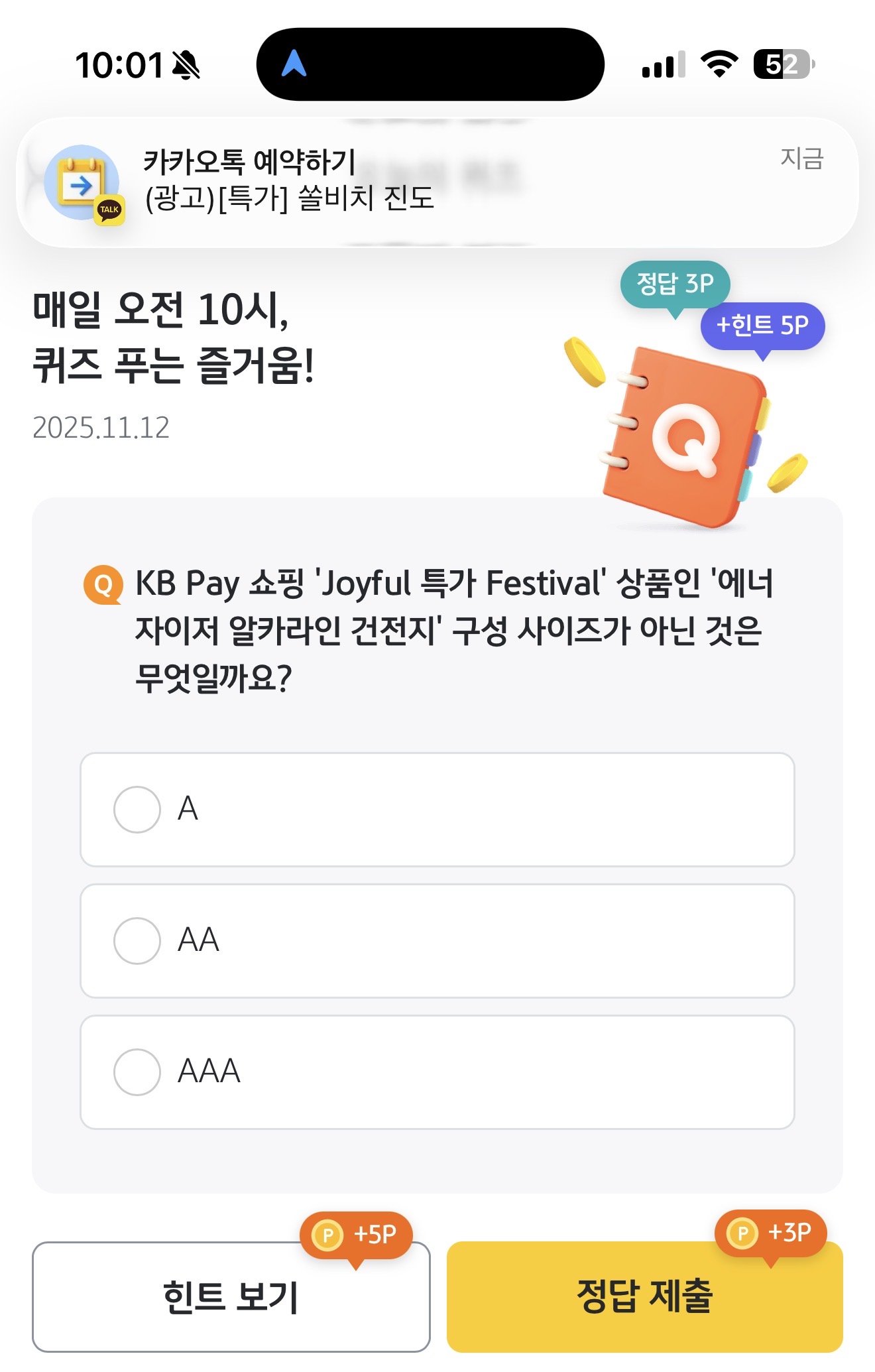 KB Pay 오늘의 퀴즈 정답은 A 입니다