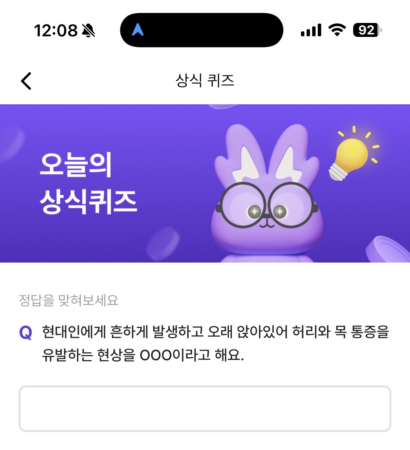 현대인에게 흔하게 발생하고 오래 앉아있어 허리와 목 통증을 유발하는 현상을 OOO이라고 해요. 주관식 퀴즈인데요. 현대인은 다양한 질병을 가지고 살고 있죠. 시대가 변하면서 앉아있는 시간이 많아졌죠. 그러면서 자연스럽게 허리와 목 통증이 늘어나고 있습니다.