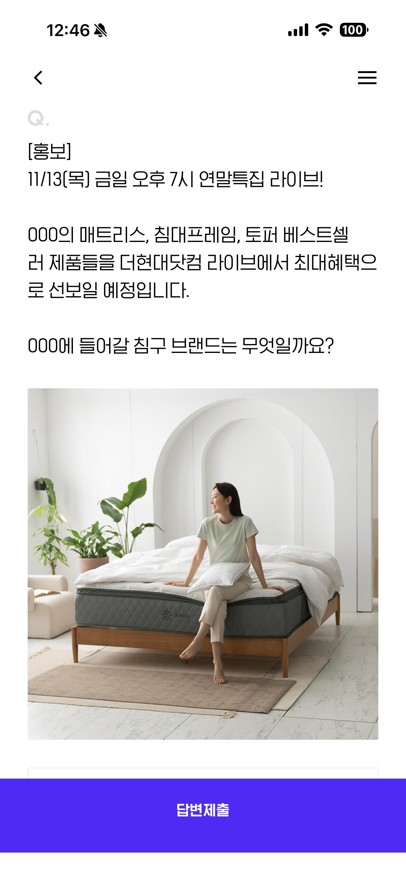 H포인트 퀴즈 11월 13일 정답(11/13(목) 금일 오후 7시 연말특집 라이브! 000의 매트리스, 침대프레임, 토퍼 베스트셀러 제품들을 더현대닷컴 라이브에서 최대혜택으로 선보일 예정입니다. 000에 들어갈 침구 브랜드는 무엇일까요?)