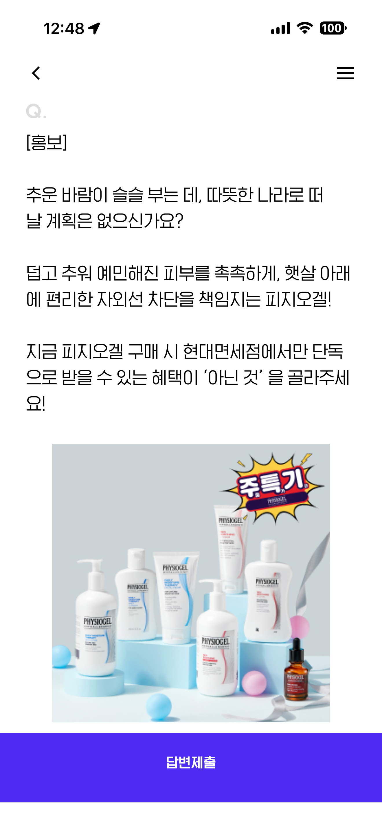 H포인트 퀴즈 11월 14일 정답(추운 바람이 슬슬 부는 데, 따뜻한 나라로 떠날 계획은 없으신가요? 덥고 추워 예민해진 피부를 촉촉하게, 햇살 아래에 편리한 자외선 차단을 책임지는 피지오겔! 지금 피지오겔 구매 시 현대면세점에서만 단독으로 받을 수 있는 혜택이 '아닌 것'을 골라주세요!)