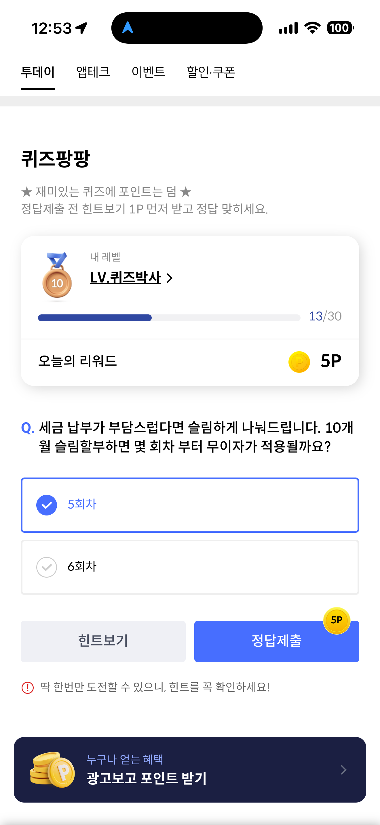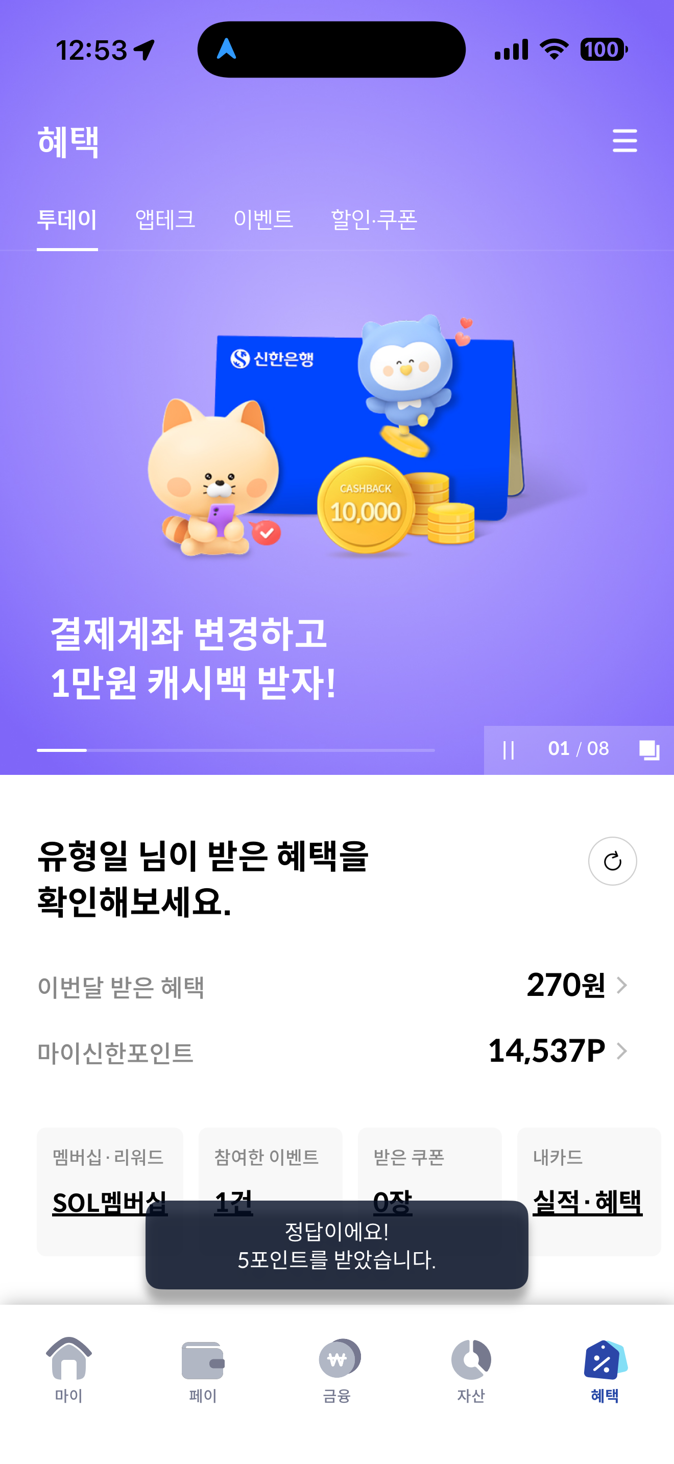 신한카드 퀴즈팡팡 정답은 5회차 입니다