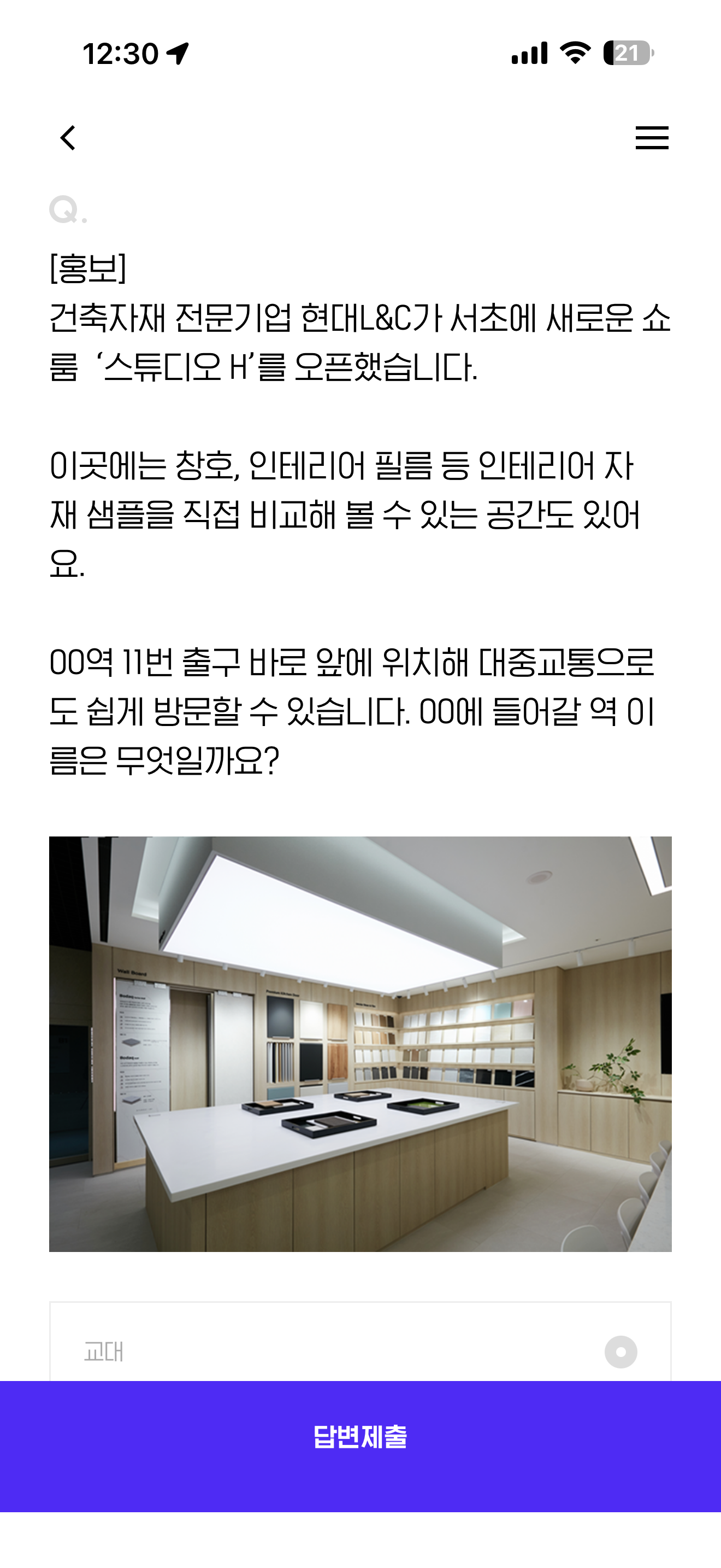 H포인트 퀴즈 11월 15일 정답(건축자재 전문기업 현대L&C가 서초에 새로운 쇼룸 '스튜디오 H'를 오픈했습니다. 이곳에는 창호, 인테리어 필름 등 인테리어 자재 샘플을 직접 비교해 볼 수 있는 공간도 있어요. 00역 11번 출구 바로 앞에 위치해 대중교통으로도 쉽게 방문할 수 있습니다. 00에 들어갈 역 이름은 무엇일까요? )