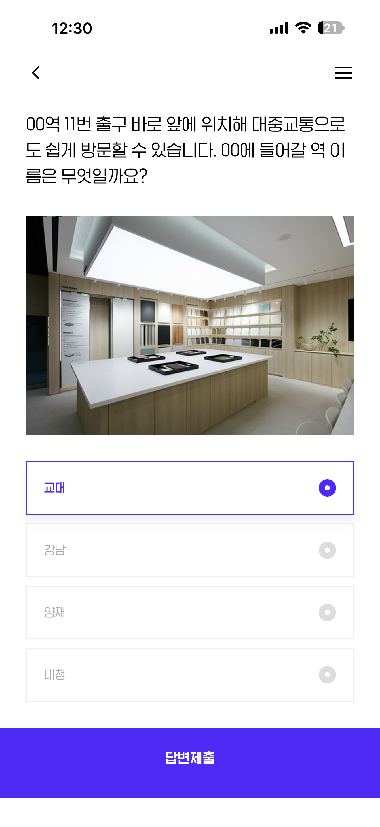 건축자재 전문기업 현대L&C가 서초에 새로운 쇼룸 '스튜디오 H'를 오픈했습니다. 이곳에는 창호, 인테리어 필름 등 인테리어 자재 샘플을 직접 비교해 볼 수 있는 공간도 있어요. 00역 11번 출구 바로 앞에 위치해 대중교통으로도 쉽게 방문할 수 있습니다. 00에 들어갈 역 이름은 무엇일까요?