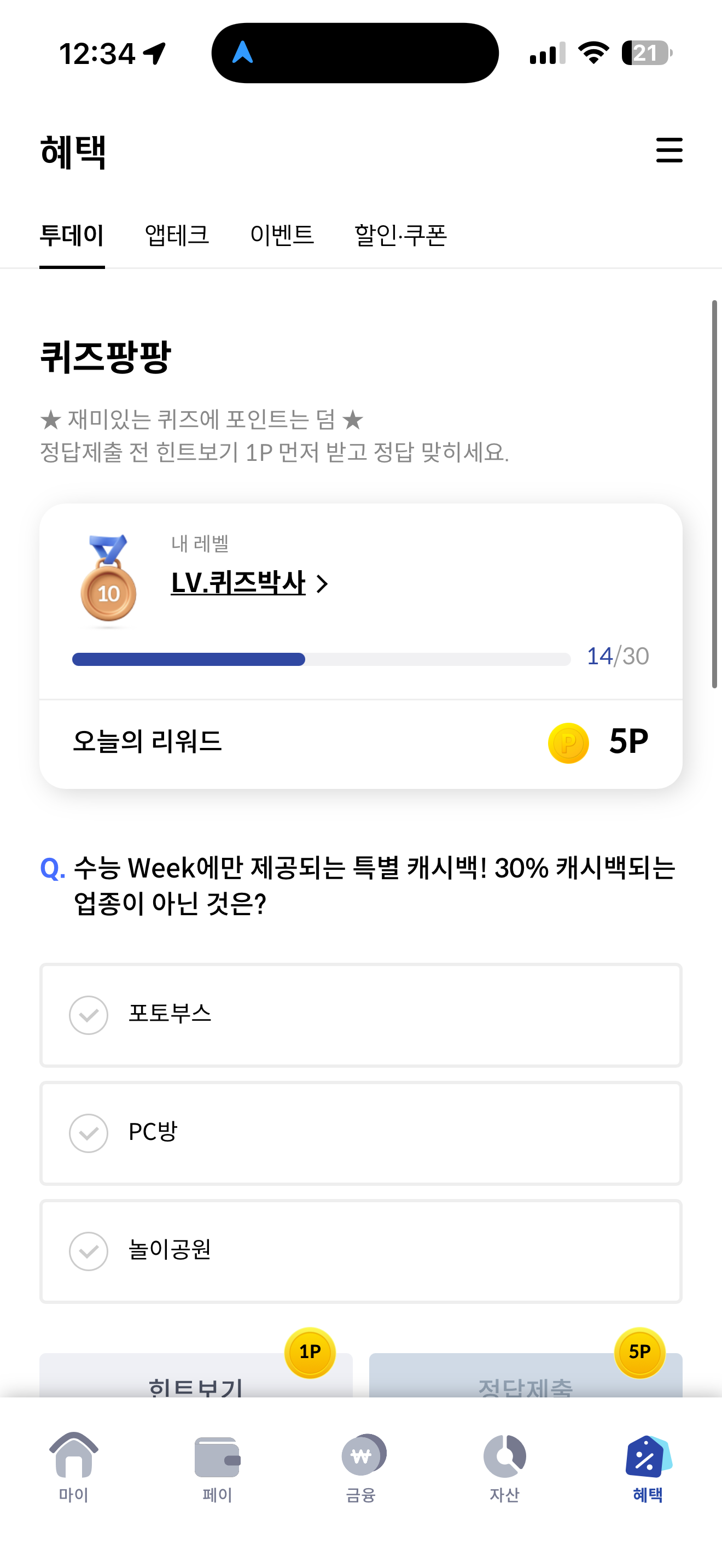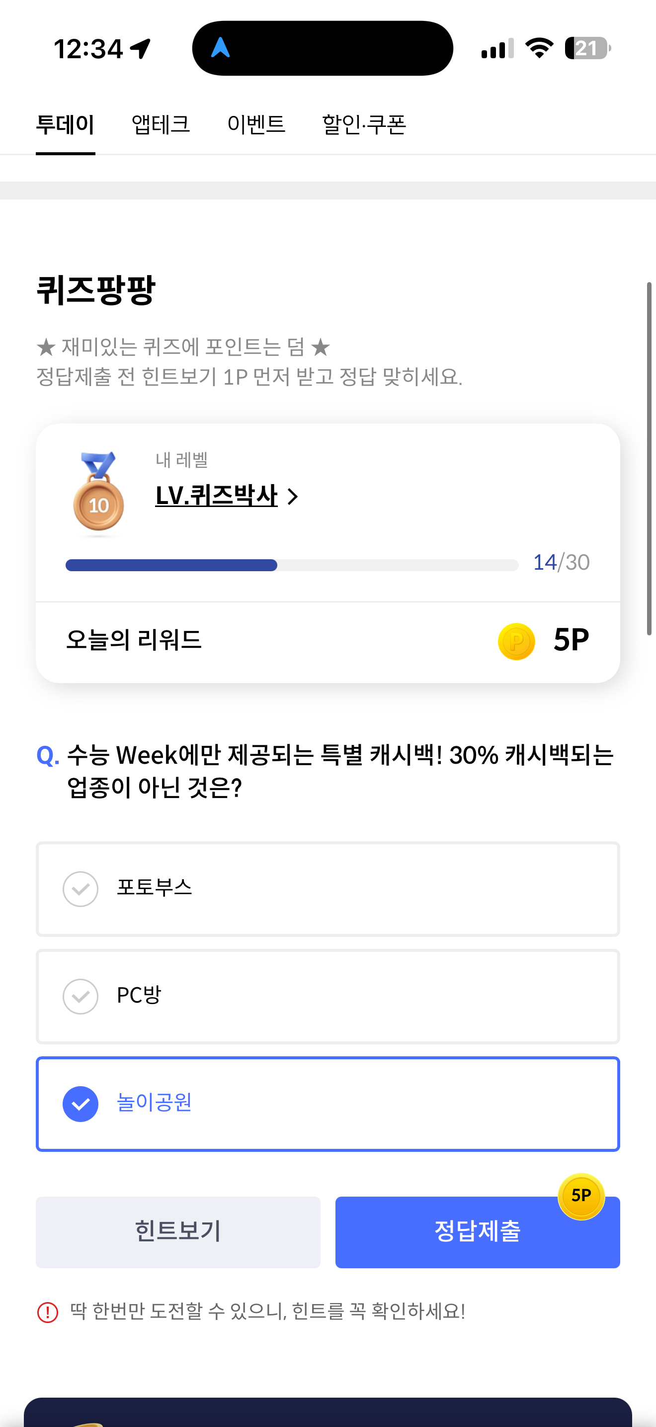 수능 Week에만 제공되는 특별 캐시백! 30% 캐시백되는 업종이 아닌 것은? 보기는 1. 포토부스 2. PC방 3. 놀이공원 입니다 수능 주간으로 특별한 혜택이 제공됩니다 잘 참고해서 혜택을 받아 보세요