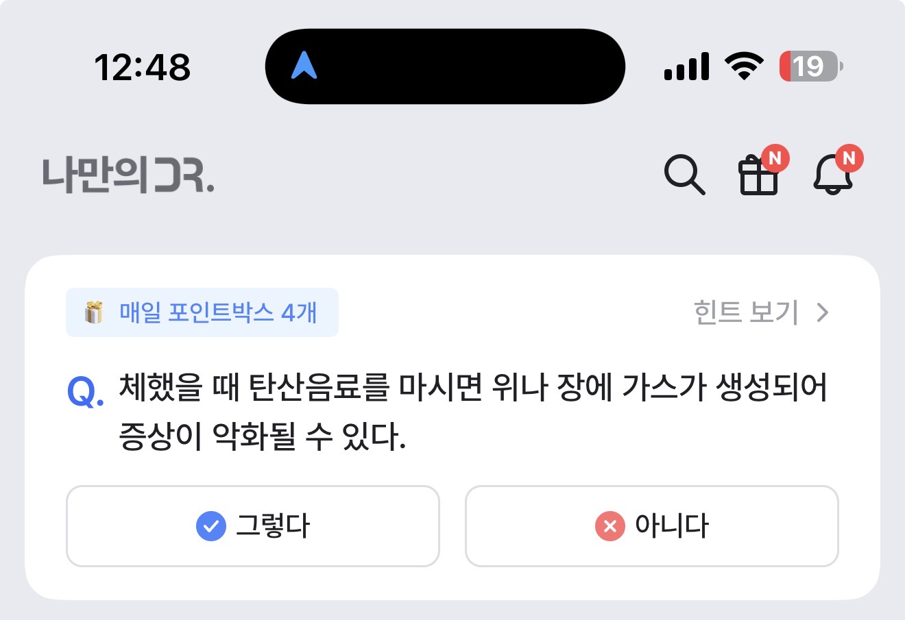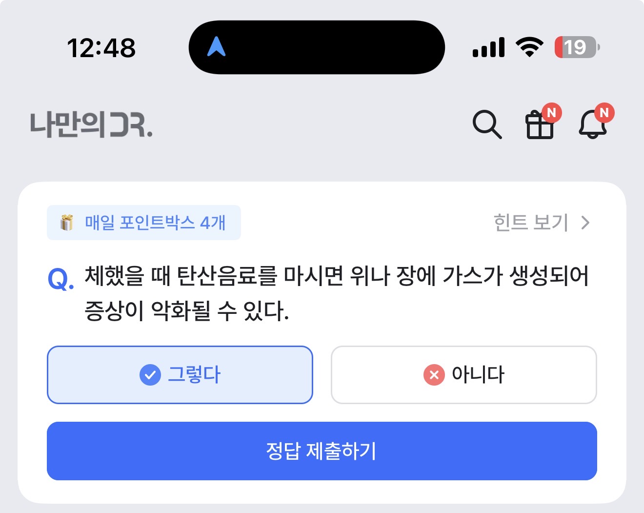 나만의 닥터 퀴즈 11월 15일 정답(체했을 때 탄산음료를 마시면 위나 장에 가스가 생성되어 증상이 악회될 수 있다)