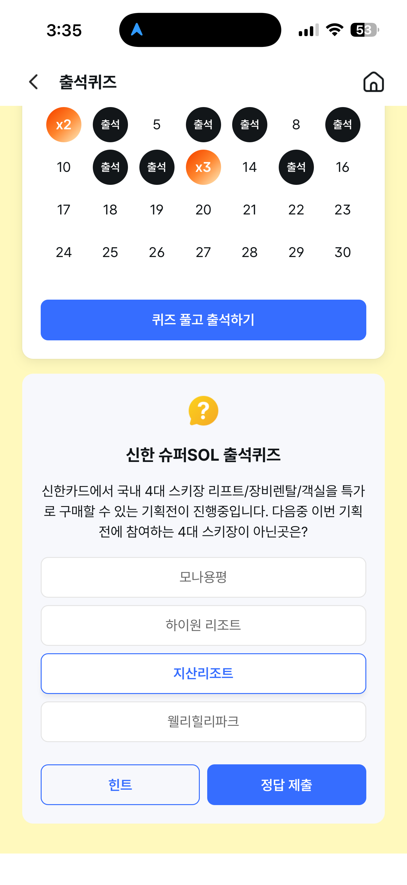 신한 슈퍼SOL 출석퀴즈 정답은 지산리조트 입니다