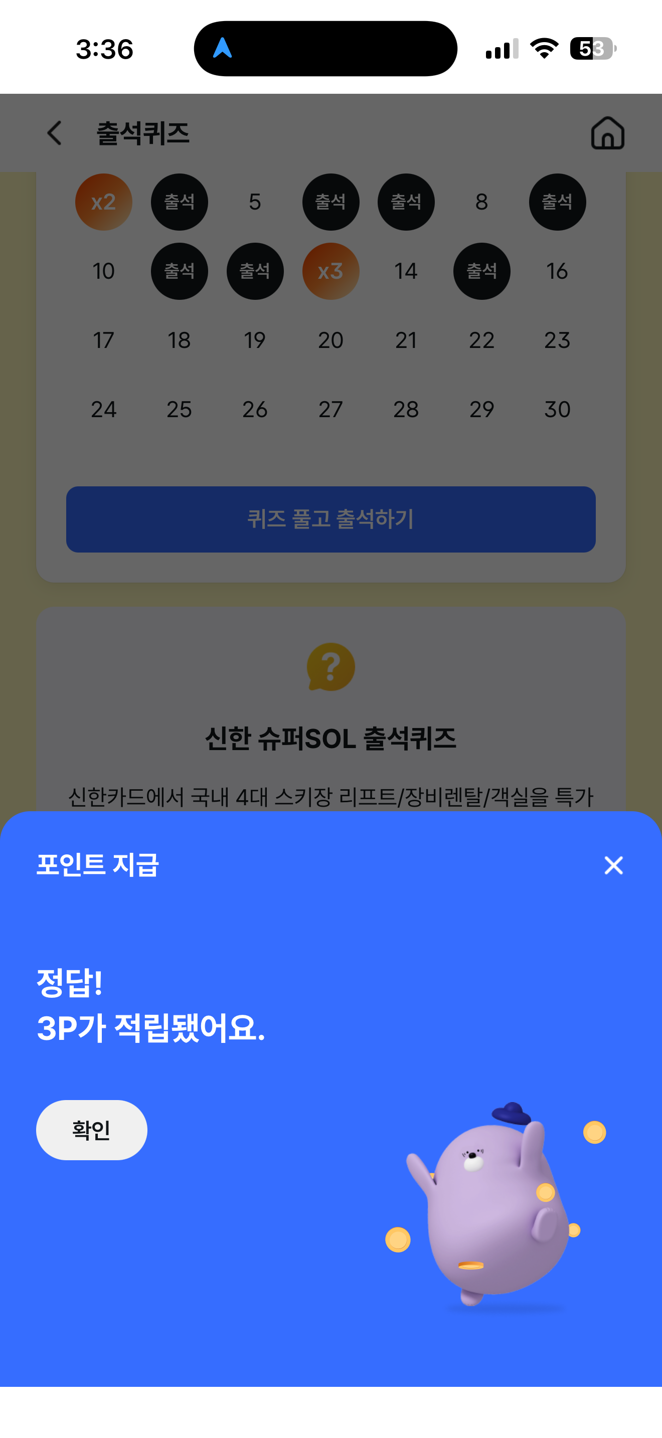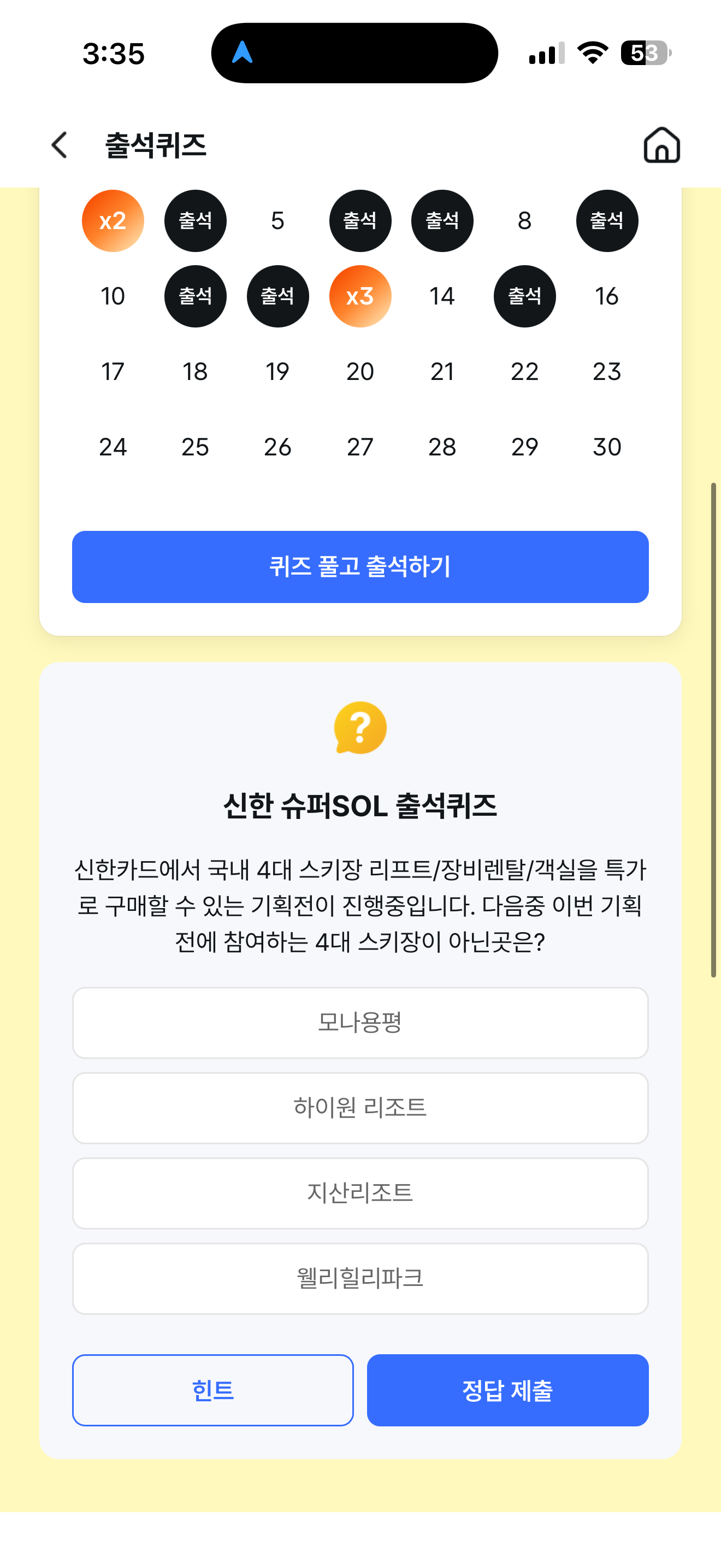 신한 슈퍼SOL 출석퀴즈 정답은 지산리조트 입니다