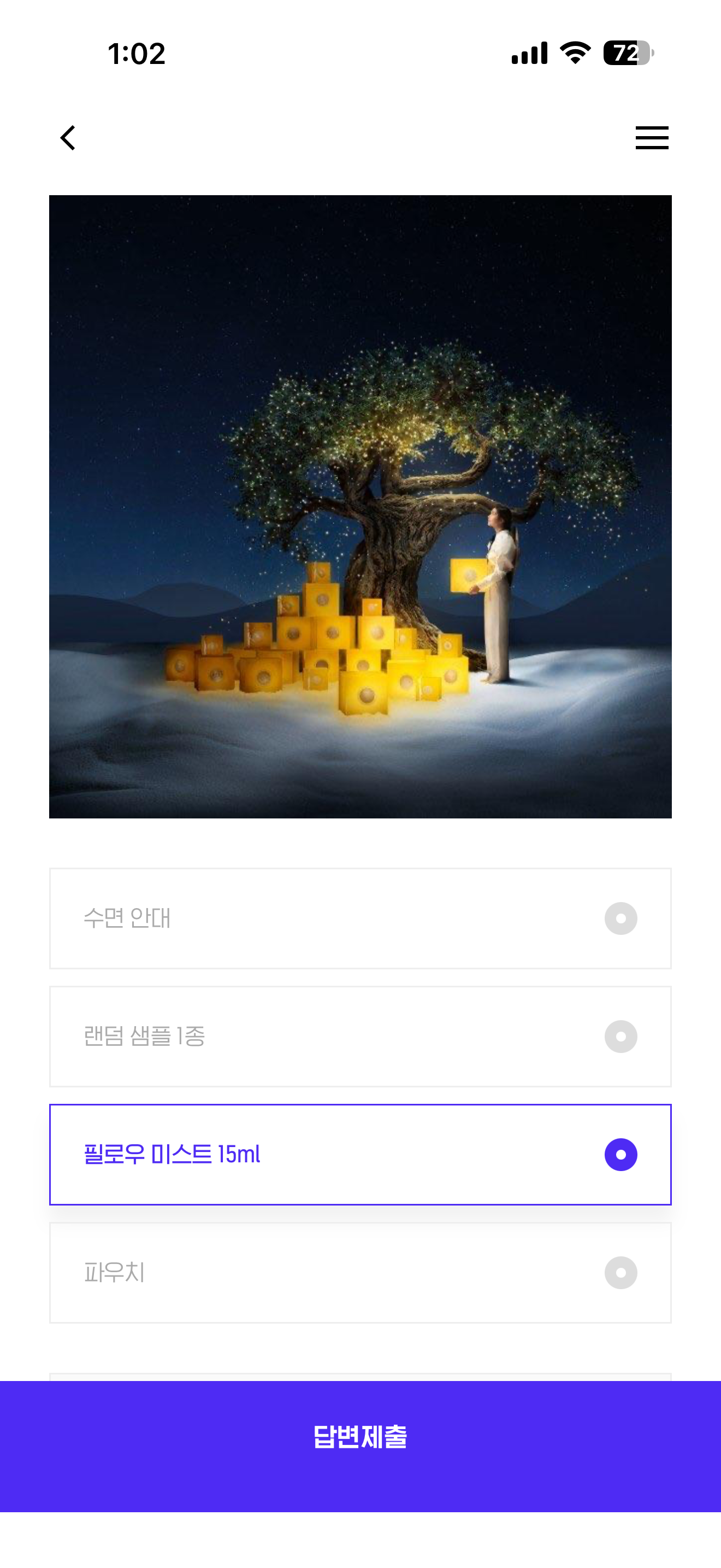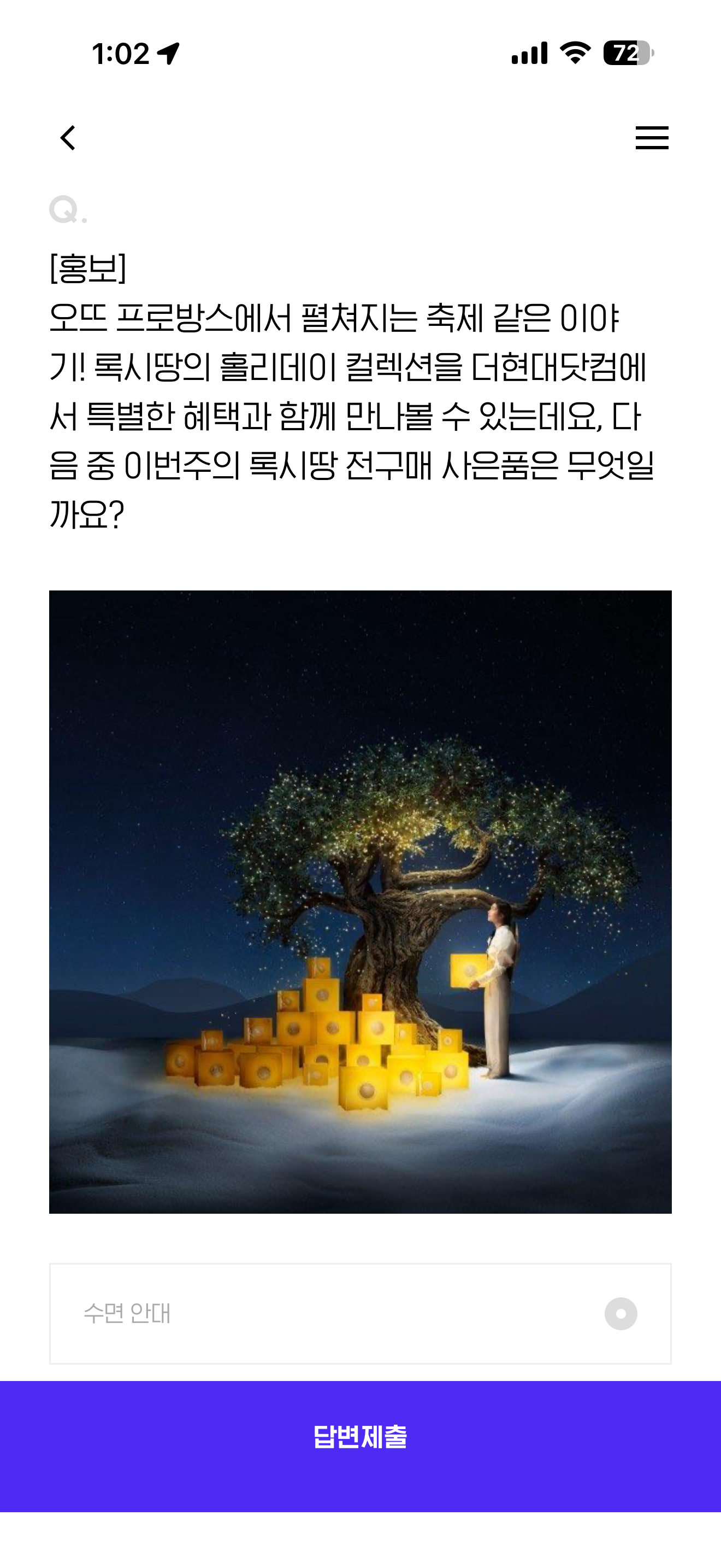 오뜨 프로방스에서 펼쳐지는 축제 같은 이야기! 록시땅의 홀리데이 컬렉션을 더현대닷컴에서 특별한 혜택과 함께 만나볼 수 있는데요, 다음 중 이번주의 록시땅 전구매 사은품은 무엇일까요? 보기는 1. 수면 안대 2. 랜덤 샘플 1종 3. 필로우 미스트 15ml 4. 파우치 입니다