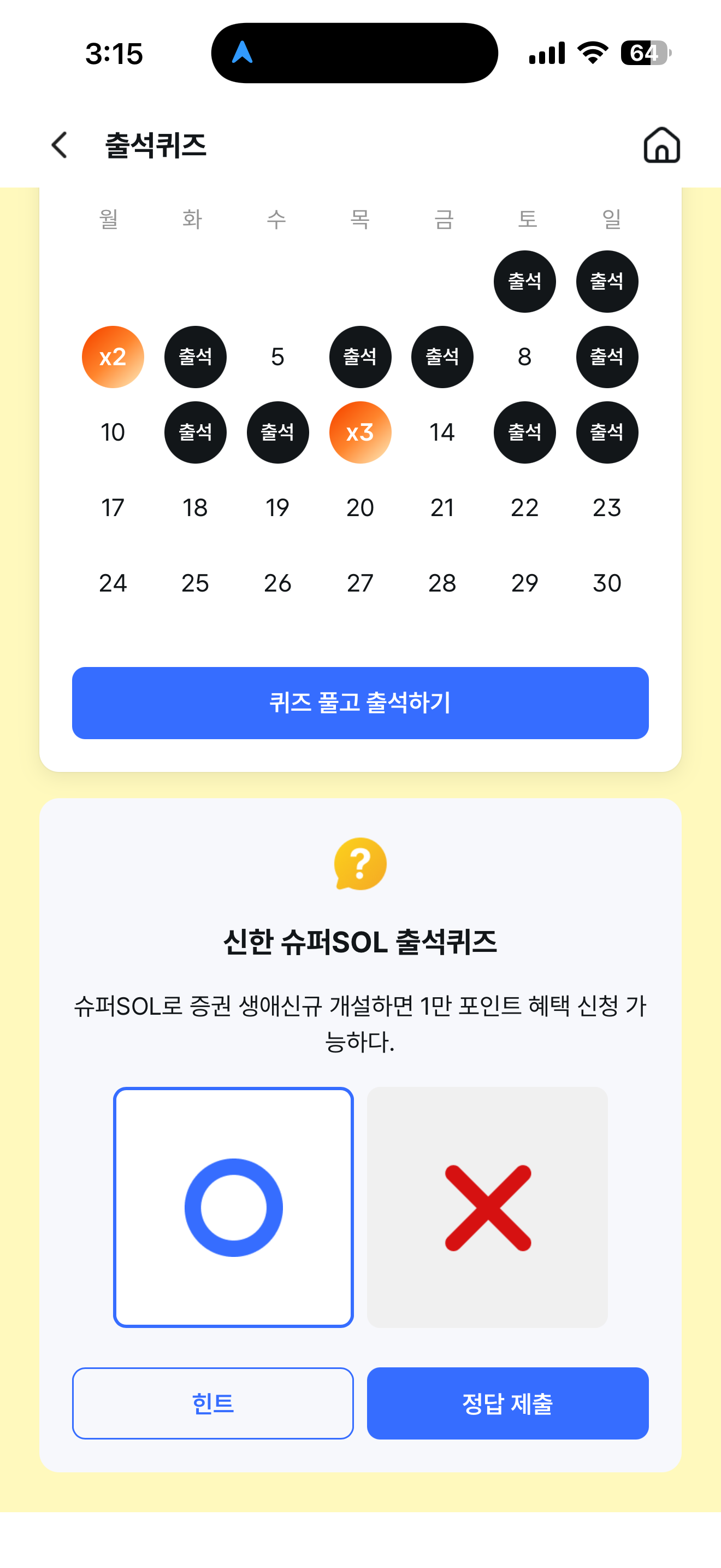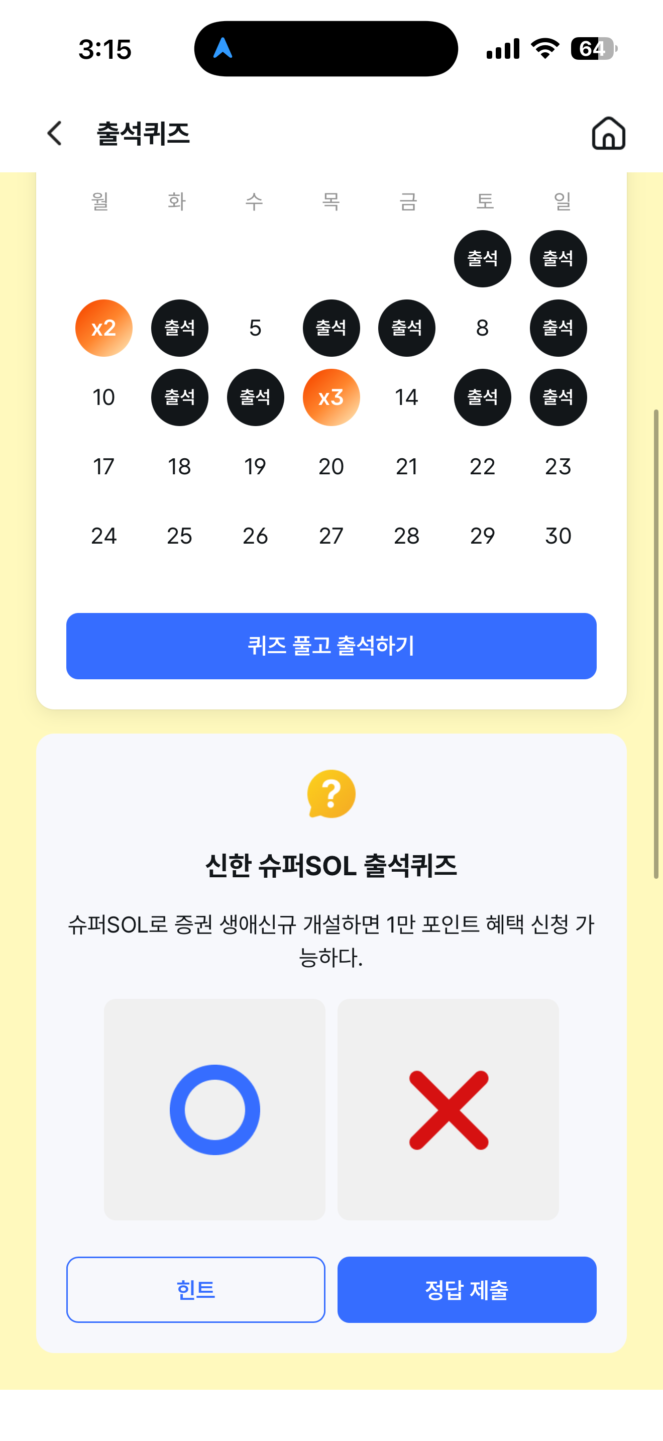 신한 슈퍼SOL 출석퀴즈 정답은 O 입니다