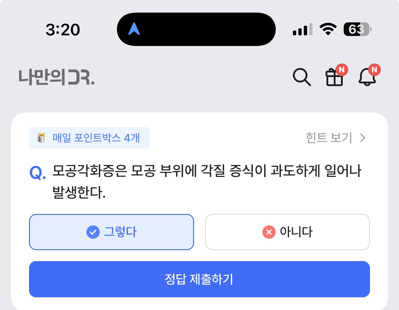 나만의 닥터 퀴즈 11월 17일 정답(모공각화증은 모공 부위에 각질 증식이 과도하게 일어나 발생한다)
