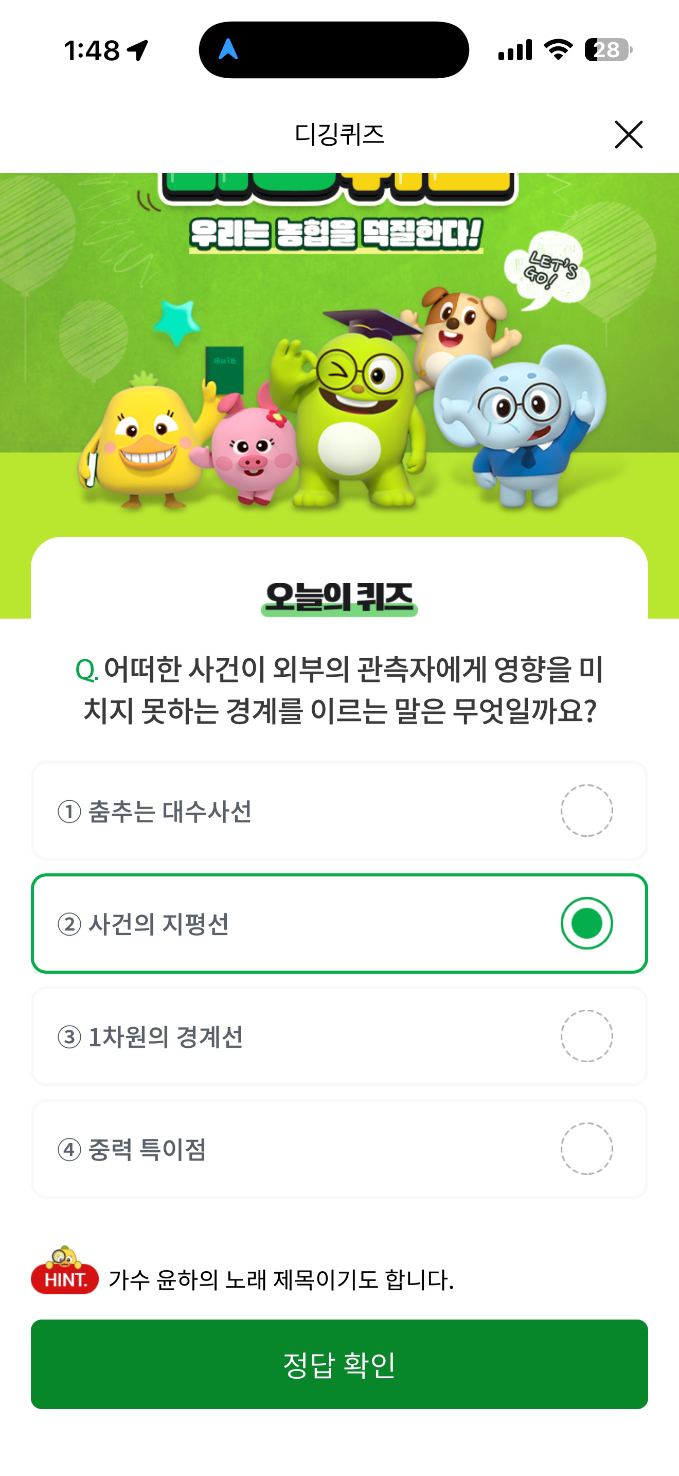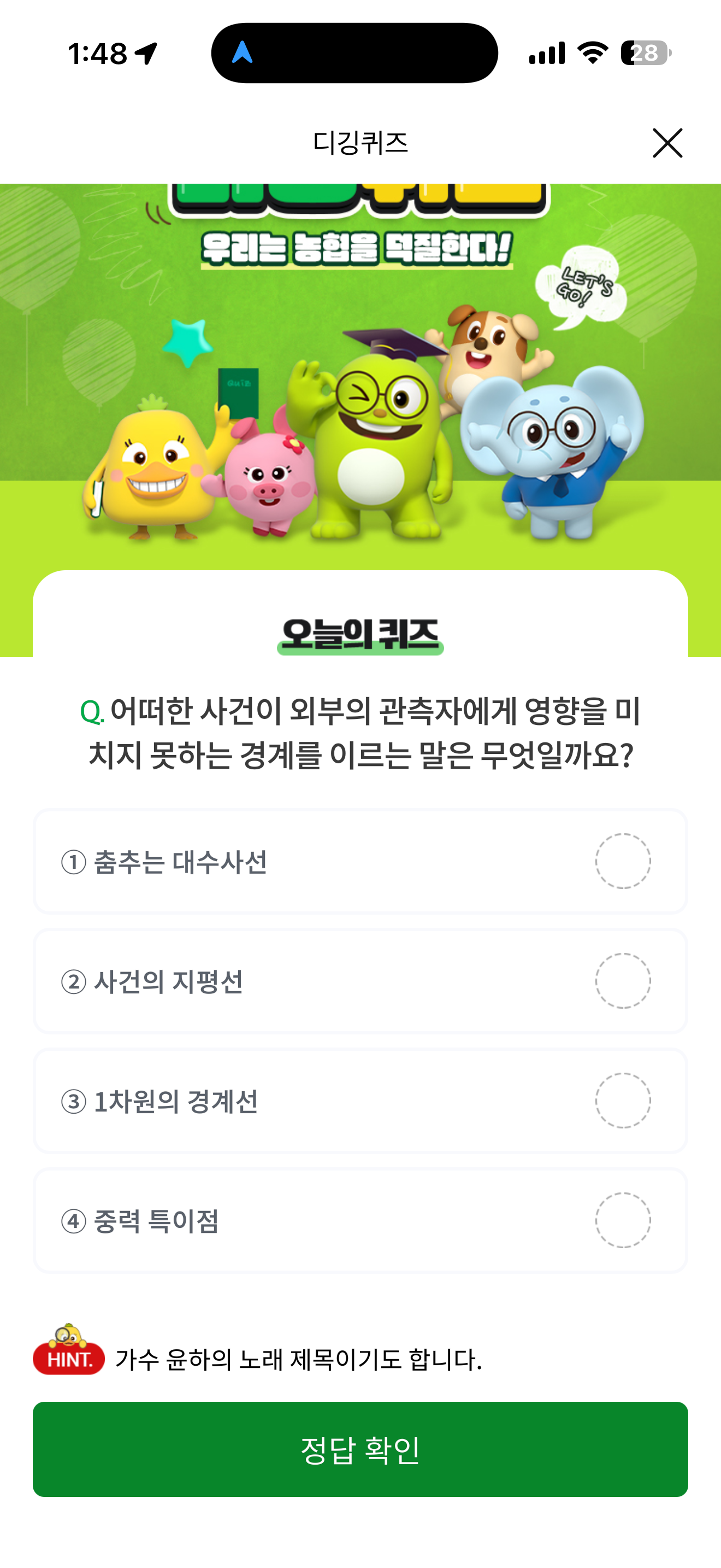 NH올원뱅크 디깅퀴즈 정답은 사건의 지평선 입니다