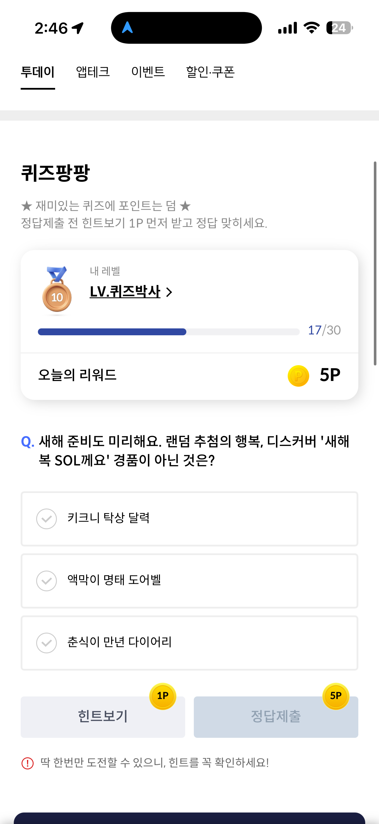 새해 준비도 미리해요. 랜덤 추첨의 행복, 디스커버 '새해복 SOL께요' 경품이 아닌 것은? 보기는 1. 키크니 탁상 달력 2. 액막이 명태 도어벨 3. 춘식이 만년 다이어리 입니다.