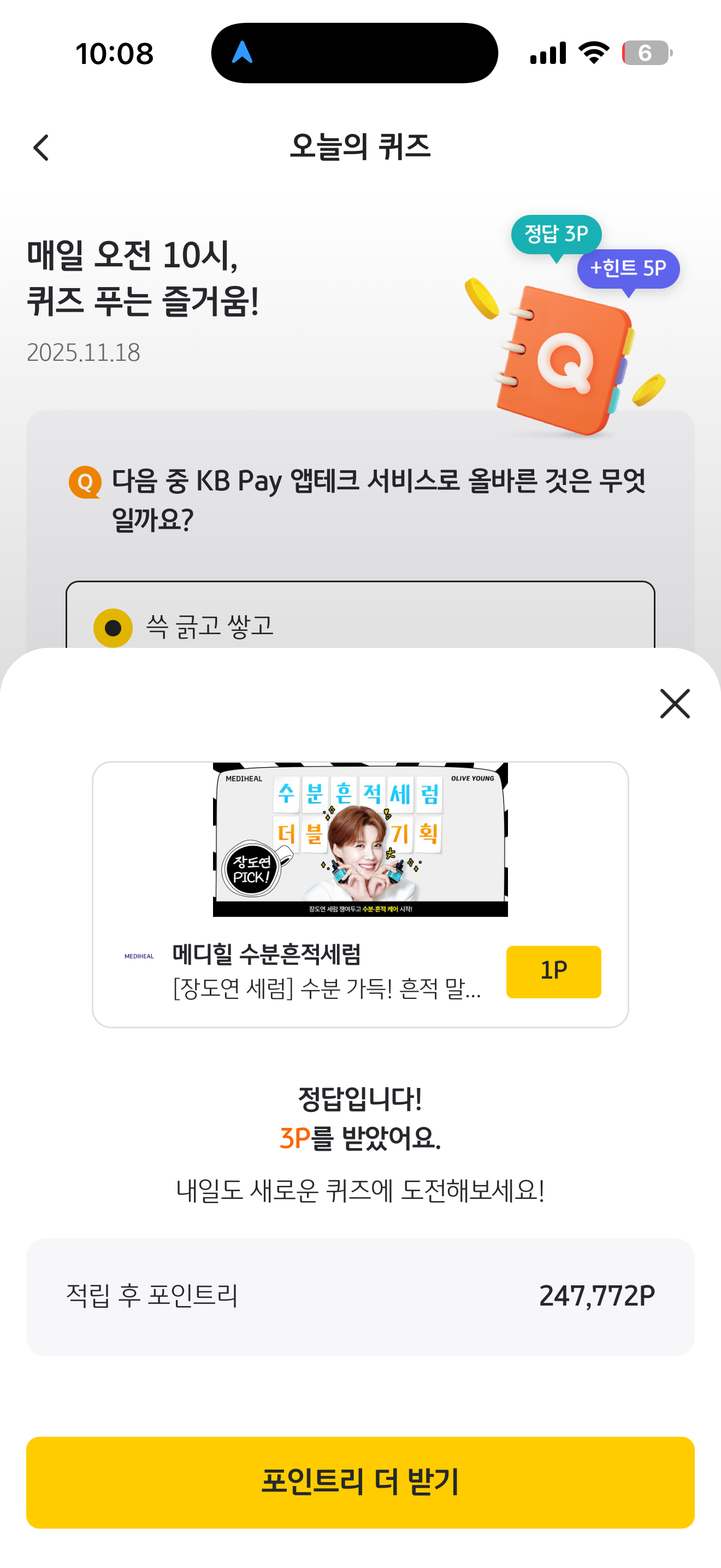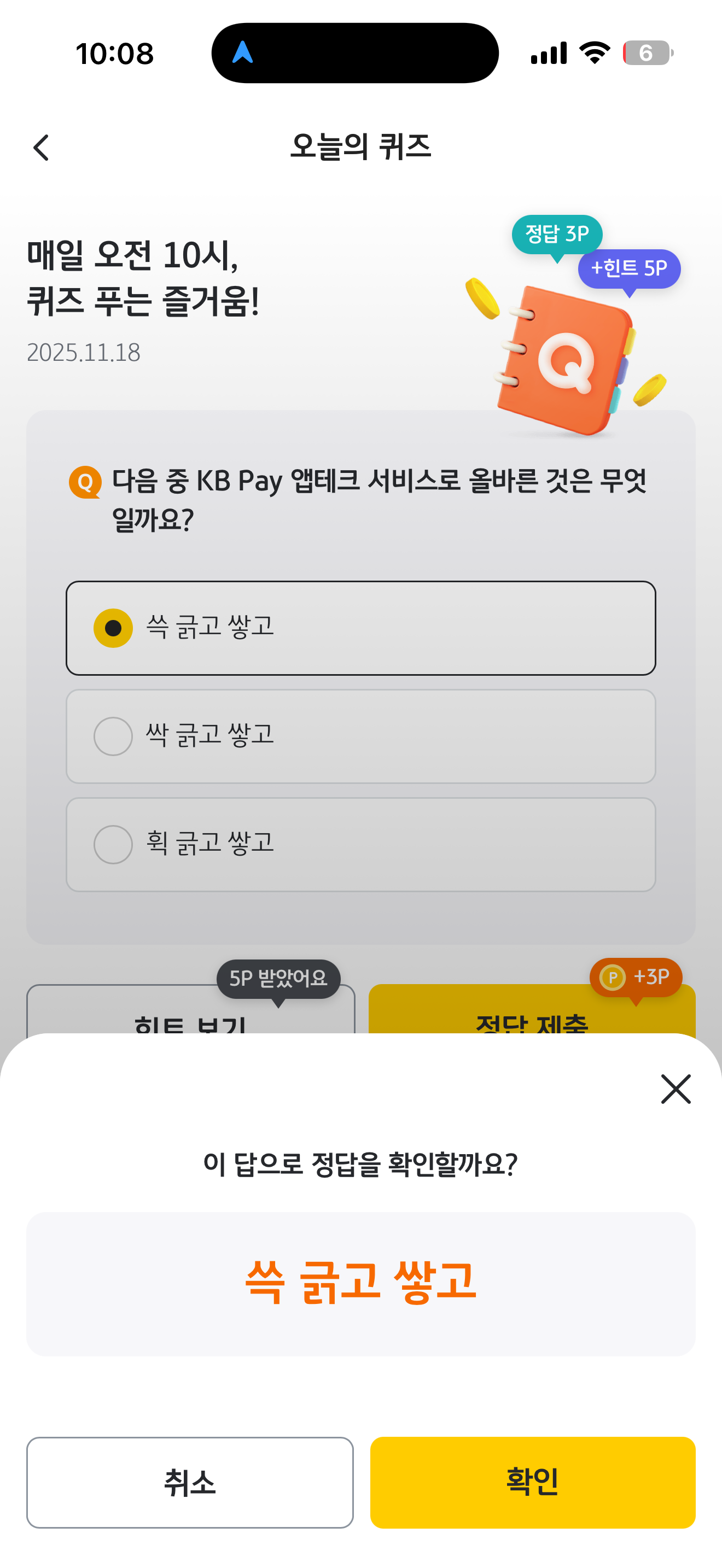 KB Pay 오늘의 퀴즈 정답은 쓱 긁고 쌓고 입니다