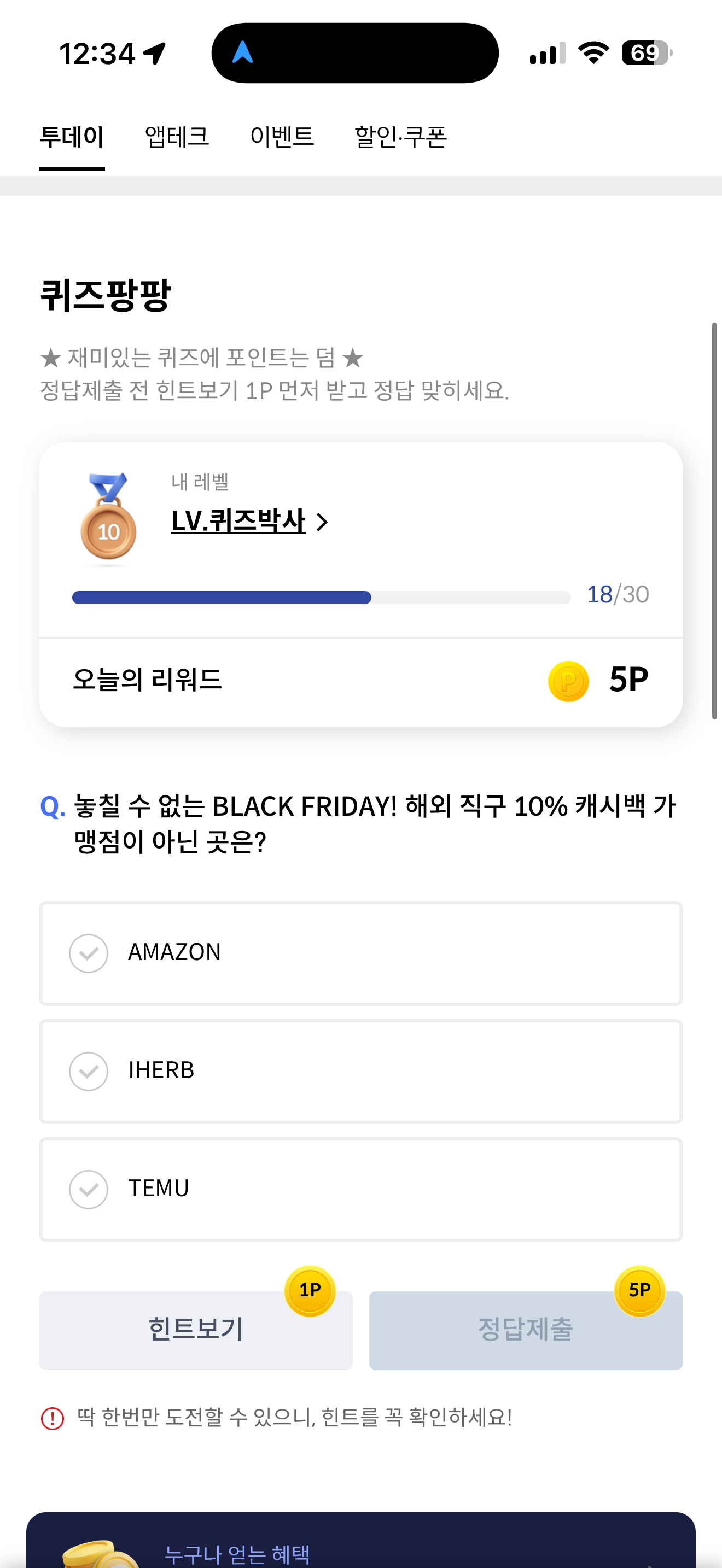 놓칠 수 없는 BLACK FRIDAY! 해외 직구 10% 캐시백 가맹점이 아닌 곳은? 보기는 1. AMAZON 2. IHERB 3. TEMU 입니다.