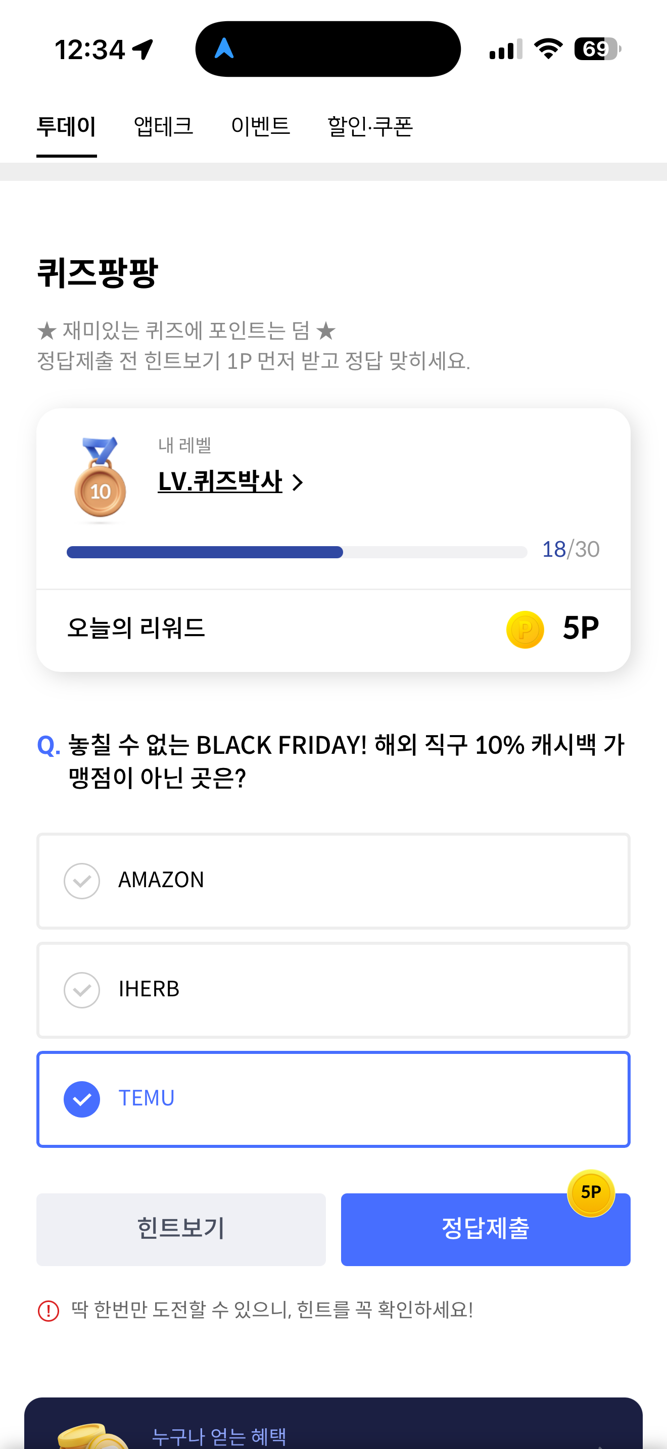 신한카드 퀴즈팡팡 정답은 TEMU 입니다