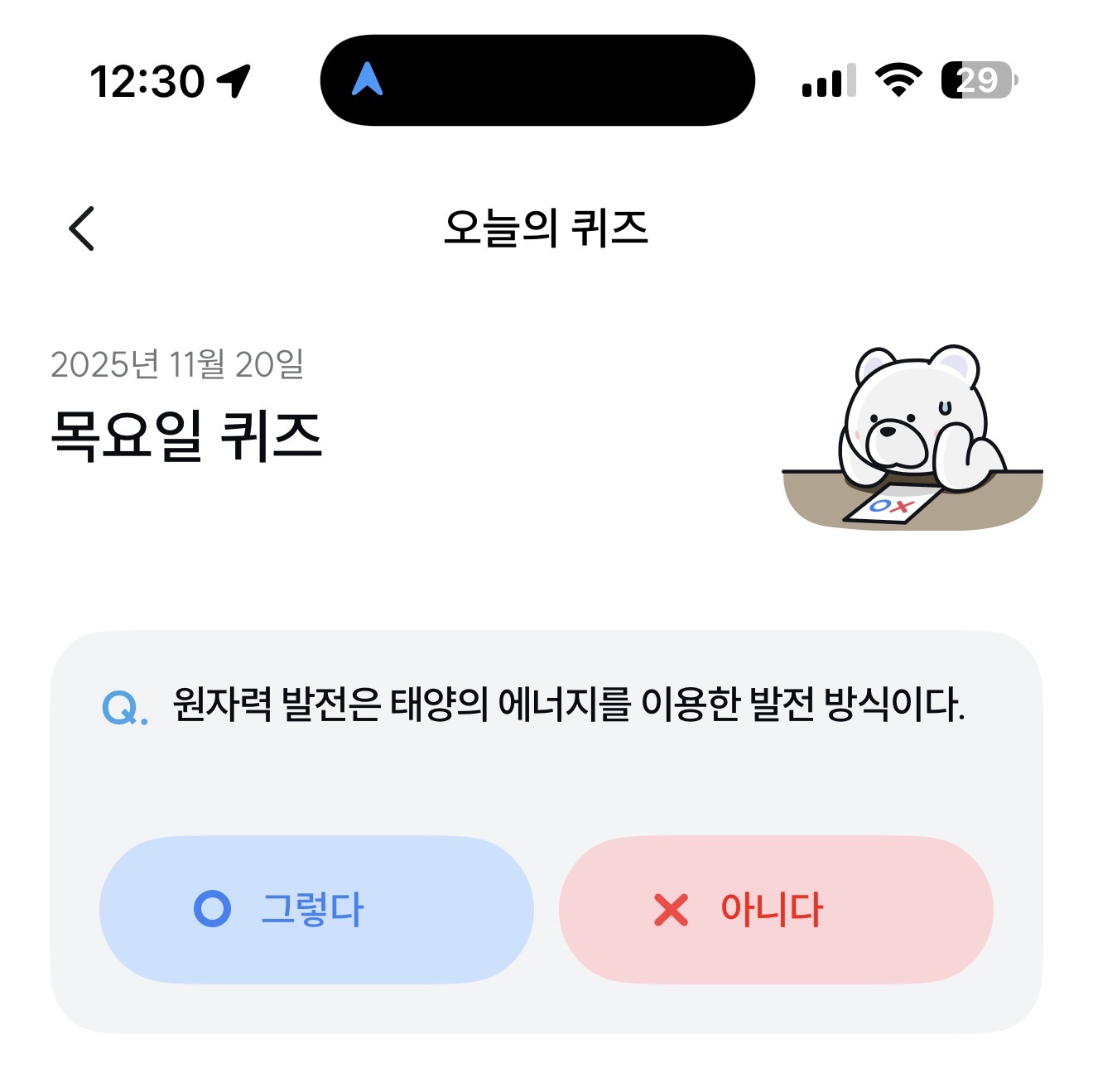 원자력 발전은 태양의 에너지를 이용한 발전 방식이다. 그렇다 아니다 선택하면 되는데요. 원자력 발전은 우리나라에서 많은 논란이 있었던 에너지 방식이죠. 원자력 발전은 위험성이 있어서 점점 없애는 추세인데요. 과연 태양의 에너지를 이용한 발전 방식일까요?