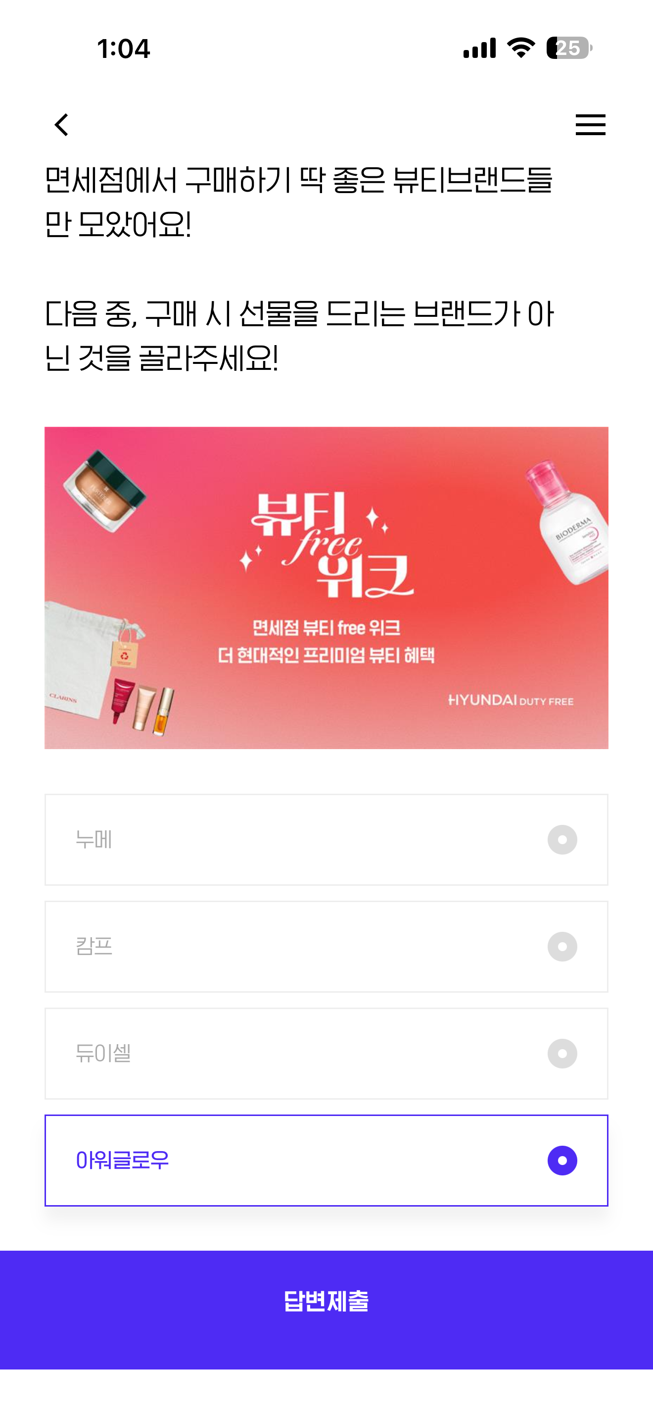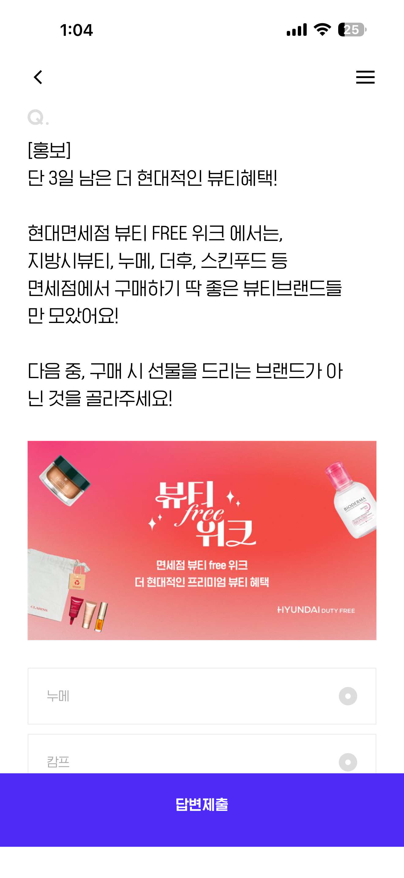 단 3일 남은 더 현대적인 뷰티혜택! 현대면세점 뷰티 FREE 위크 에서는, 지방시뷰티, 누메, 더후, 스킨푸드 등 면세점에서 구매하기 딱 좋은 뷰티브랜드들만 모았어요! 다음 중, 구매 시 선물을 드리는 브랜드가 아닌 것을 골라주세요!