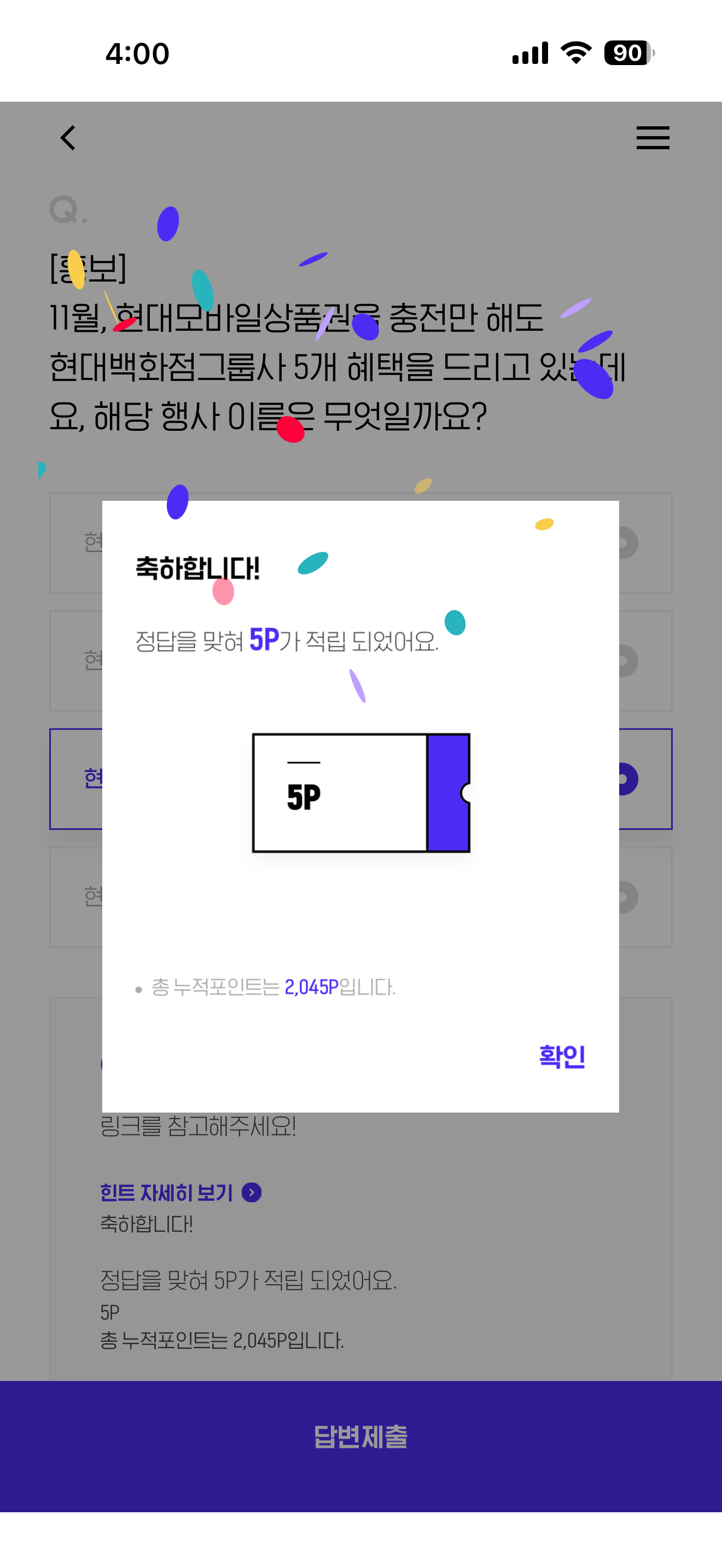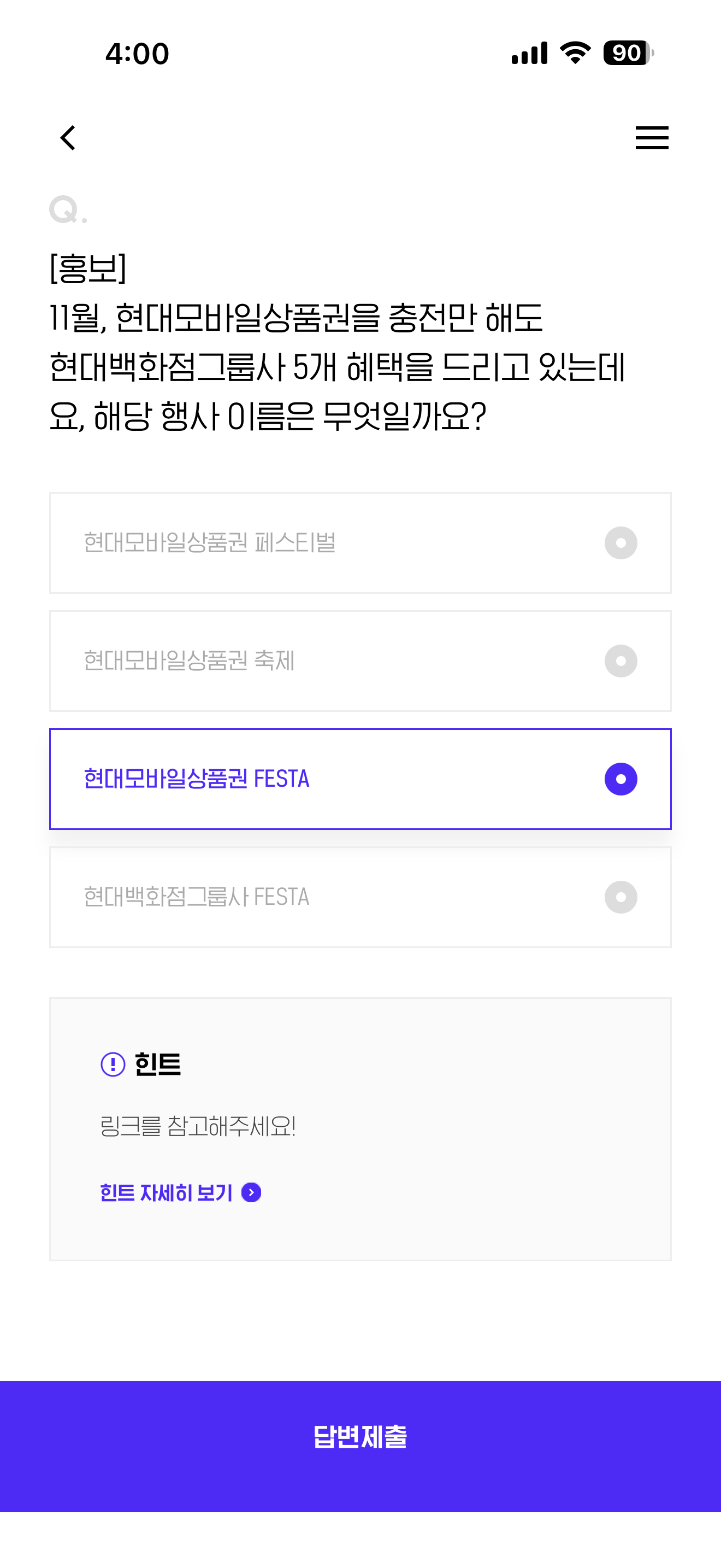 H포인트 퀴즈 정답은 현대모바일상품권 FESTA 입니다