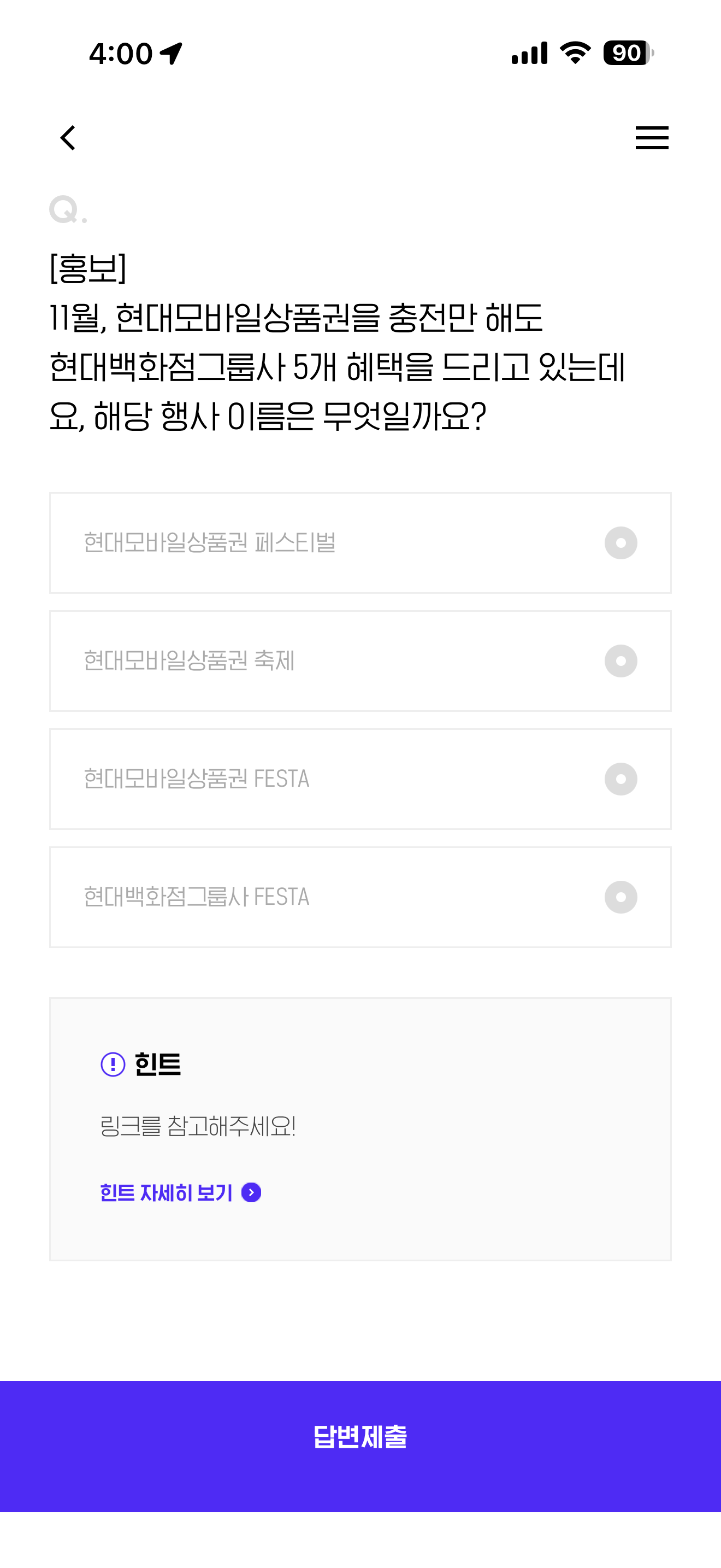H포인트 퀴즈 정답은 현대모바일상품권 FESTA 입니다