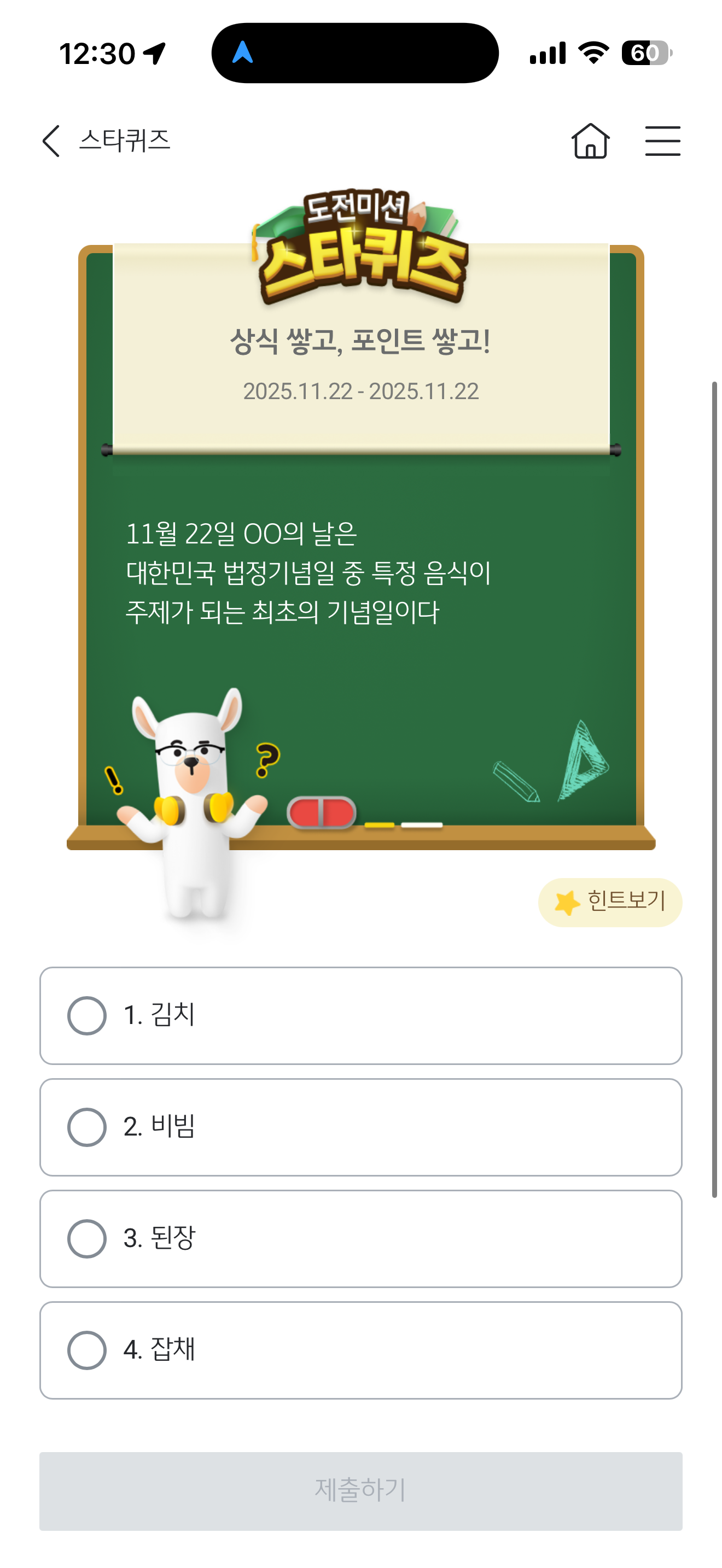 KB스타뱅킹 스타퀴즈 11월 22일 정답(11월 22일 OO의 날은 대한민국 법정기념일 중 특정 음식이 주제가 되는 최초의 기념일이다)