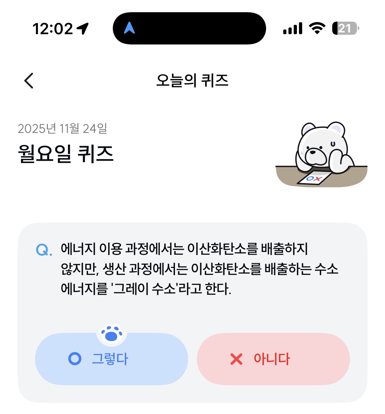 기후행동 기회소득 오늘의 퀴즈 11월 24일 정답(에너지 이용 과정에서는 이산화탄소를 배출하지 않지만, 생산 과정에서는 이산화탄소를 배출하는 수소에너지를 '그레이 수소'라고 한다)