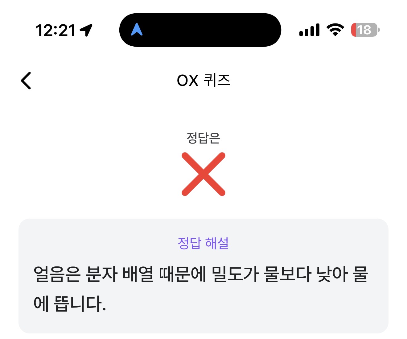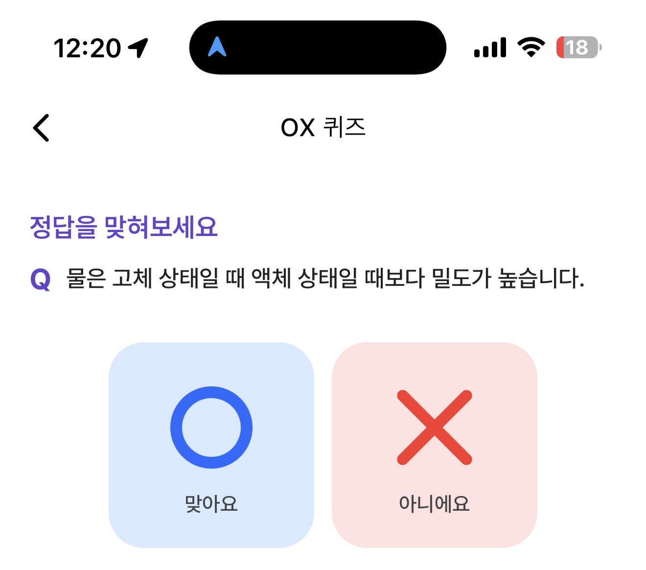 물은 고체 상태일 때 액체 상태일 때보다 밀도가 높습니다 O, X 퀴즈인데요. 물은 고체 상태일때 밀도가 높아질까요? 낮아질까요? 고체와 액체의 상태를 잘 생각해 보면 답이 보일 것입니다.