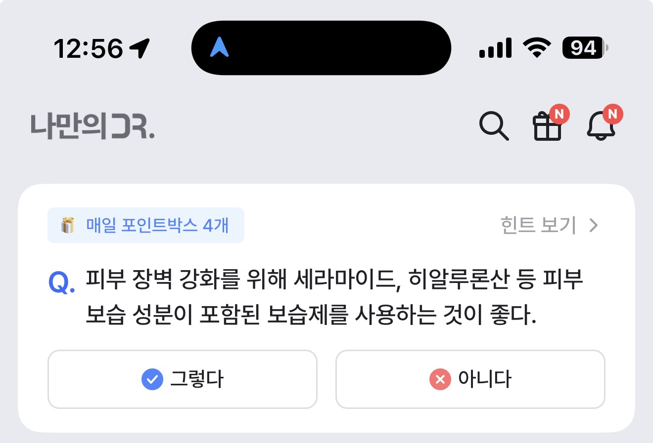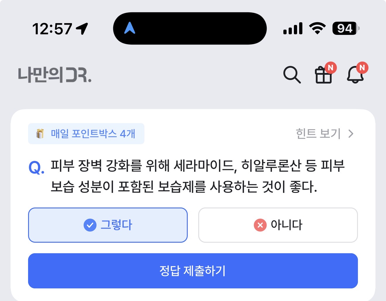 나만의 닥터 퀴즈 11월 25일 정답(피부 장벽 강화를 위해 세라마이드, 히알루론산 등 피부 보습 성분이 포함된 보습제를 사용하는 것이 좋다)