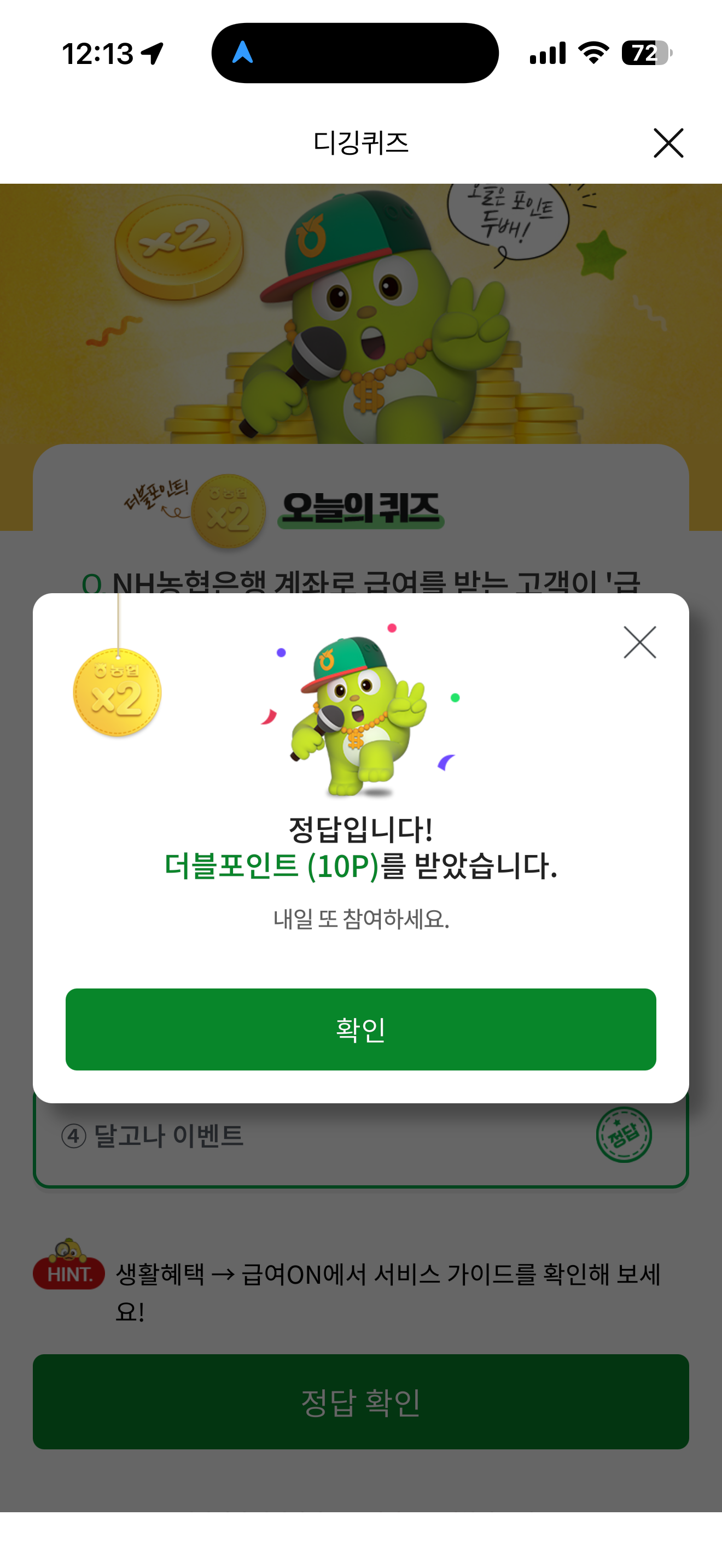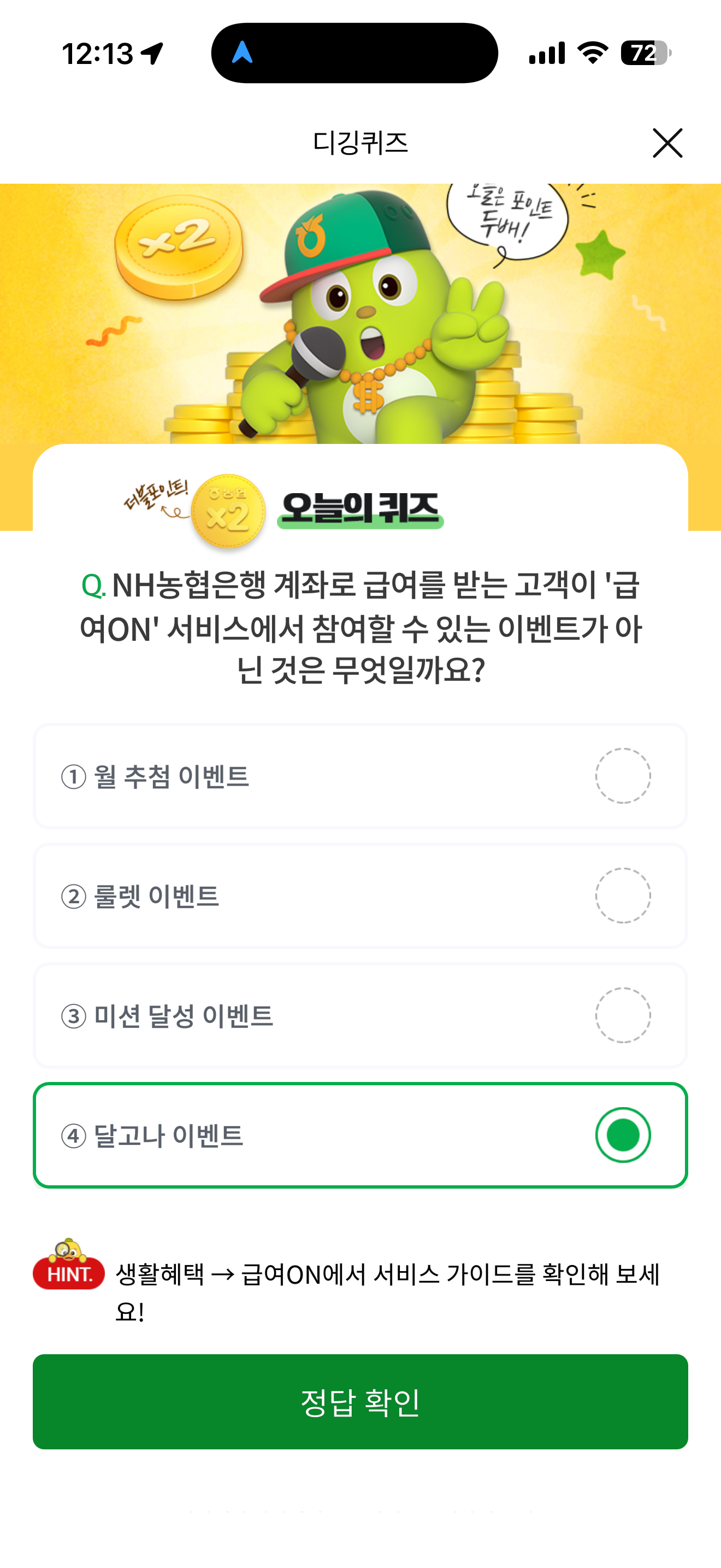 NH올원뱅크 디깅퀴즈 11월 26일 정답(NH농협은행 계좌로 급여를 받는 고객이 '급여ON' 서비스에서 참여할 수 있는 이벤트가 아닌 것은 무엇일까요?)