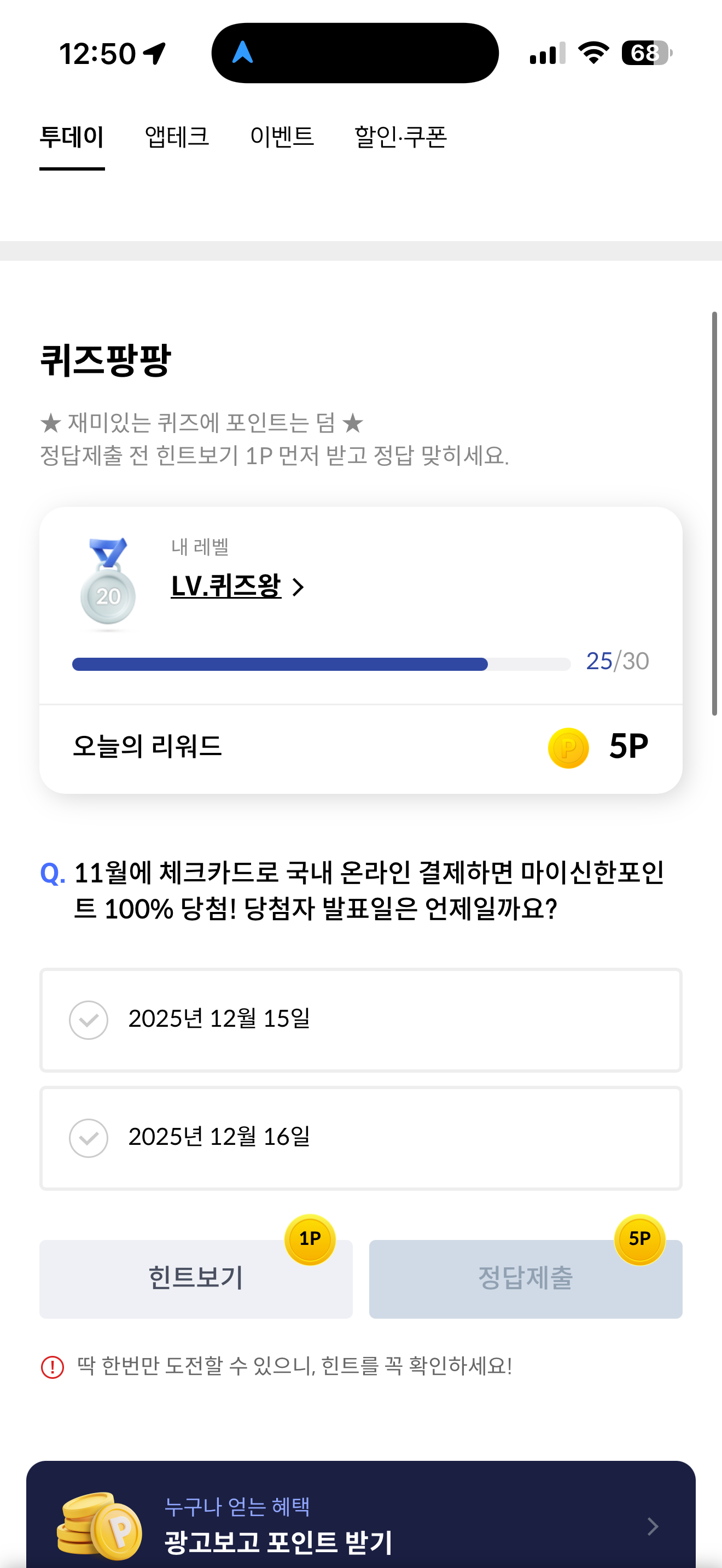 신한카드 퀴즈팡팡 정답은 2025년 12월 16일 입니다