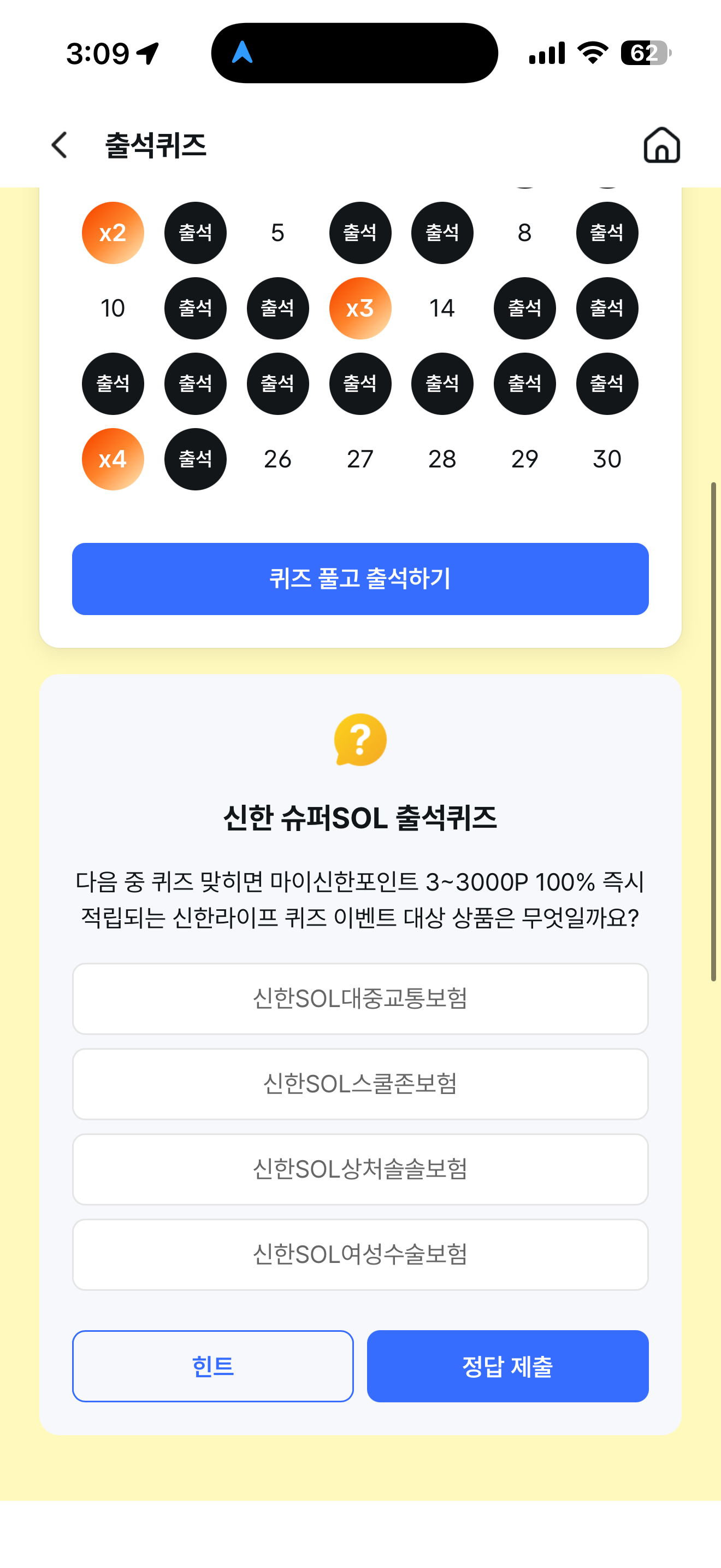 신한 슈퍼SOL 출석퀴즈 정답은 신한SOL대중교통보험 입니다