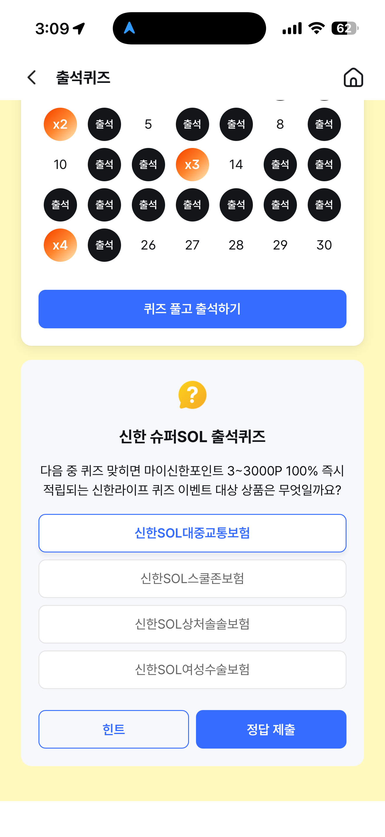 신한 슈퍼SOL 출석퀴즈 정답은 신한SOL대중교통보험 입니다