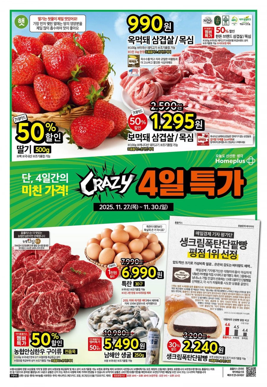 11월 27일부터 11월 30일까지 진행되는 홈플러스 행사 전단지 할인 행사 내용입니다. 옥목돼 삼결살/목심 저렴하게 판매되고 딸기도 저렴하네요. 잘 참고해 보세요