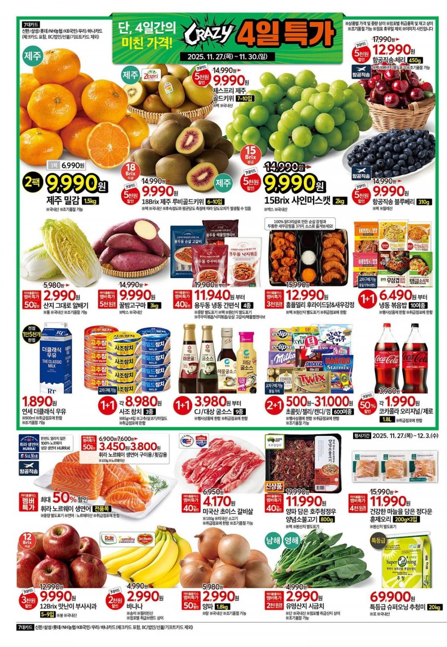 11월 27일부터 11월 30일까지 진행되는 홈플러스 행사 전단지 할인 행사 내용입니다. 옥목돼 삼결살/목심 저렴하게 판매되고 딸기도 저렴하네요. 잘 참고해 보세요