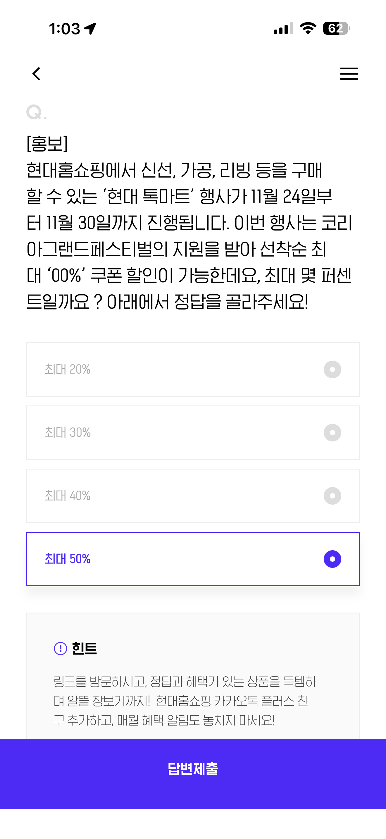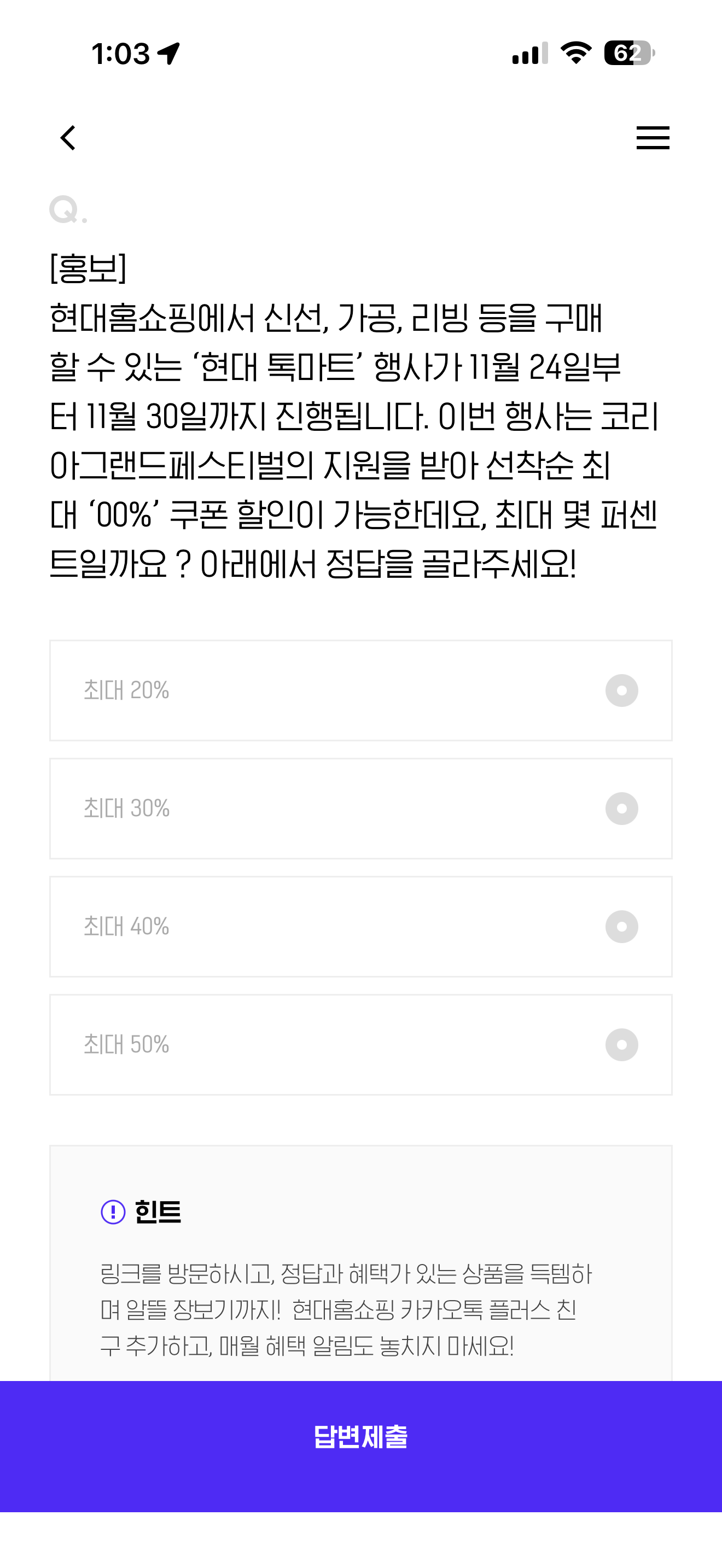 현대홈쇼핑에서 신선, 가공, 리빙 등을 구매할 수 있는 '현대 톡마트' 행사가 11월 24일부터 11월 30일까지 진행됩니다. 이번 행사는 코리아그랜드페스티벌의 지원을 받아 선착순 최대 '00%' 쿠폰 할인이 가능한데요, 최대 몇 퍼센트일까요? 아래에서 정답을 골라주세요!