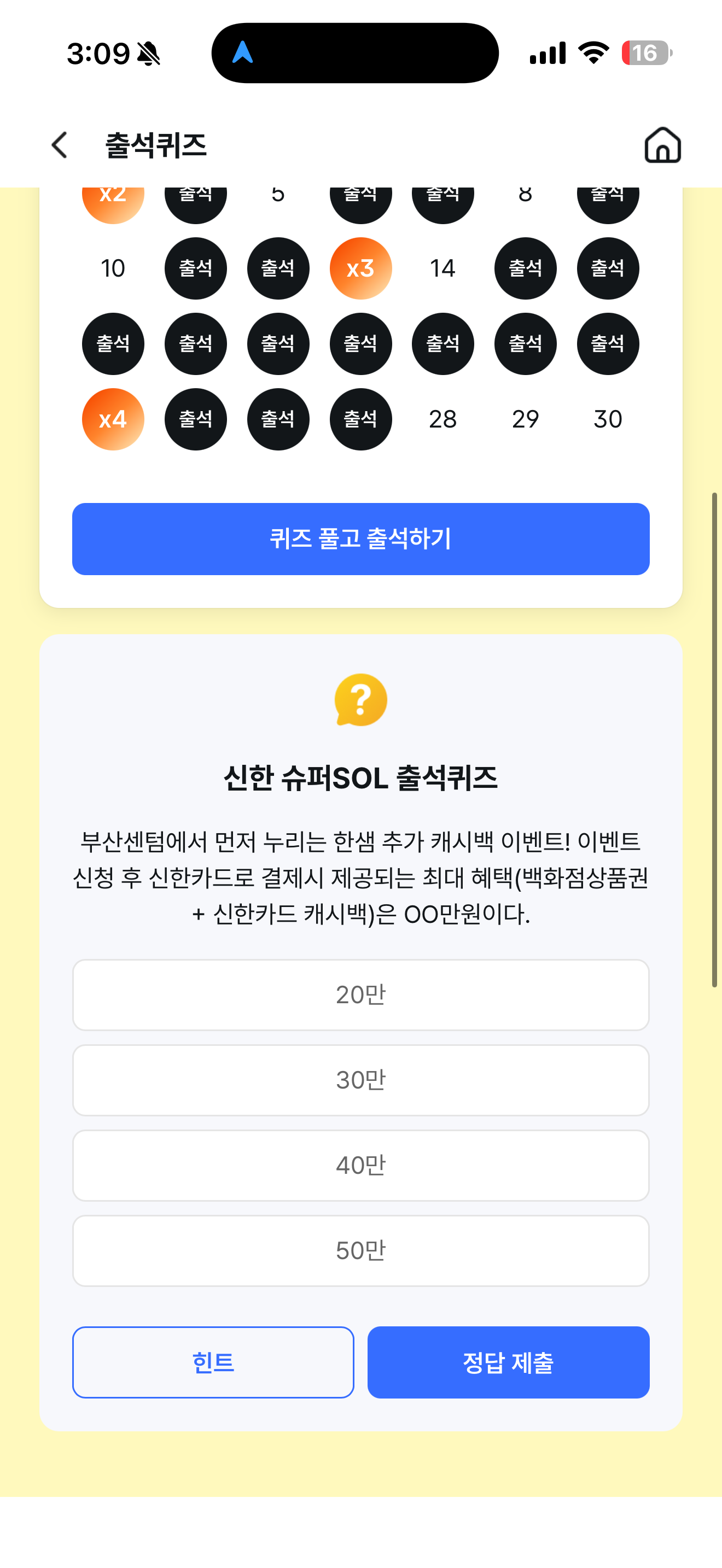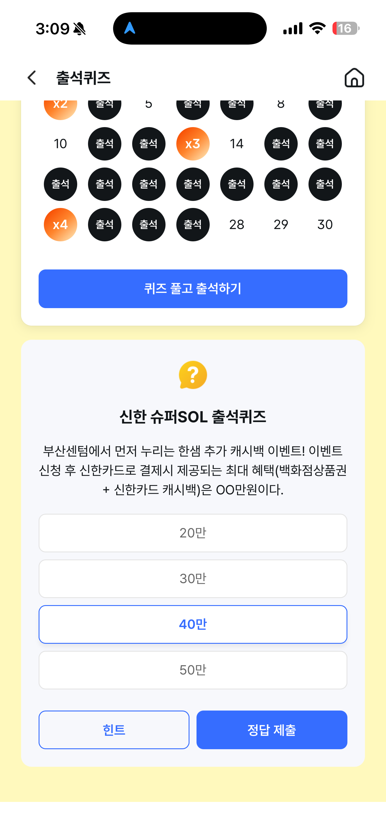 신한 슈퍼SOL 출석퀴즈 정답은 40만 입니다