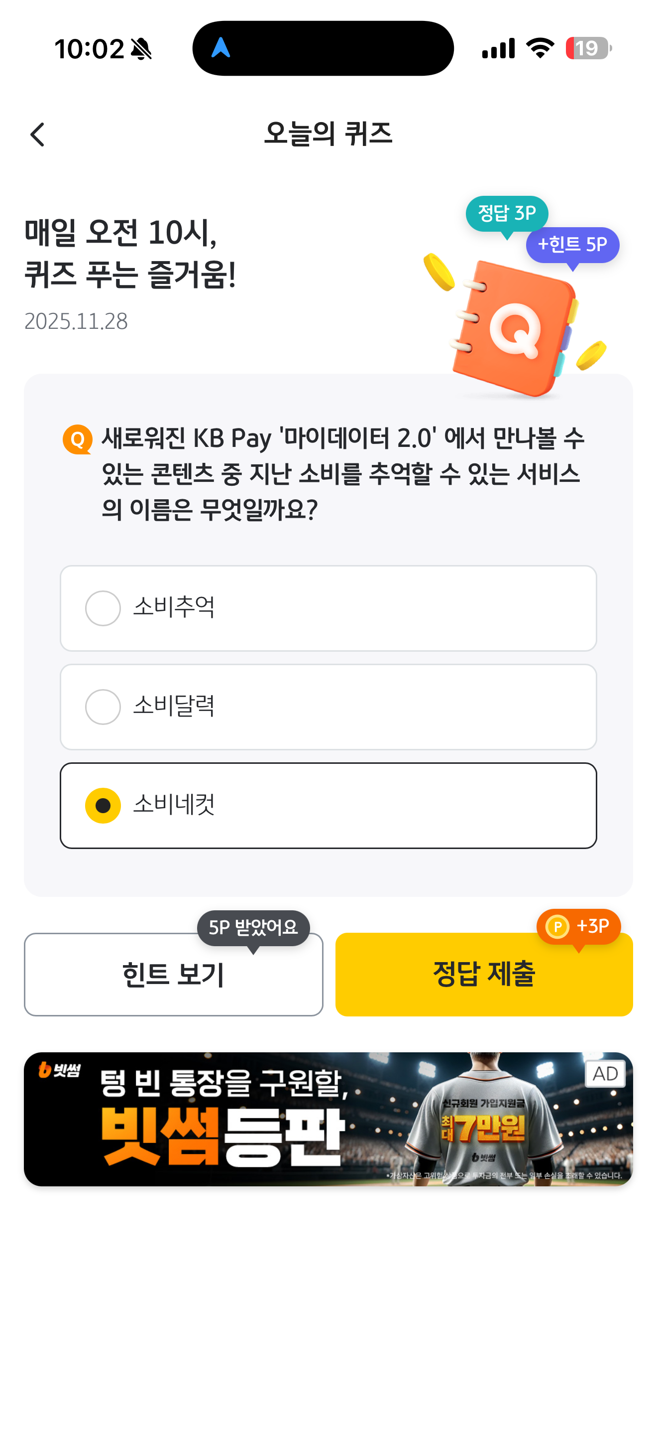 KB pay 오늘의 퀴즈 정답은 소비네컷 입니다