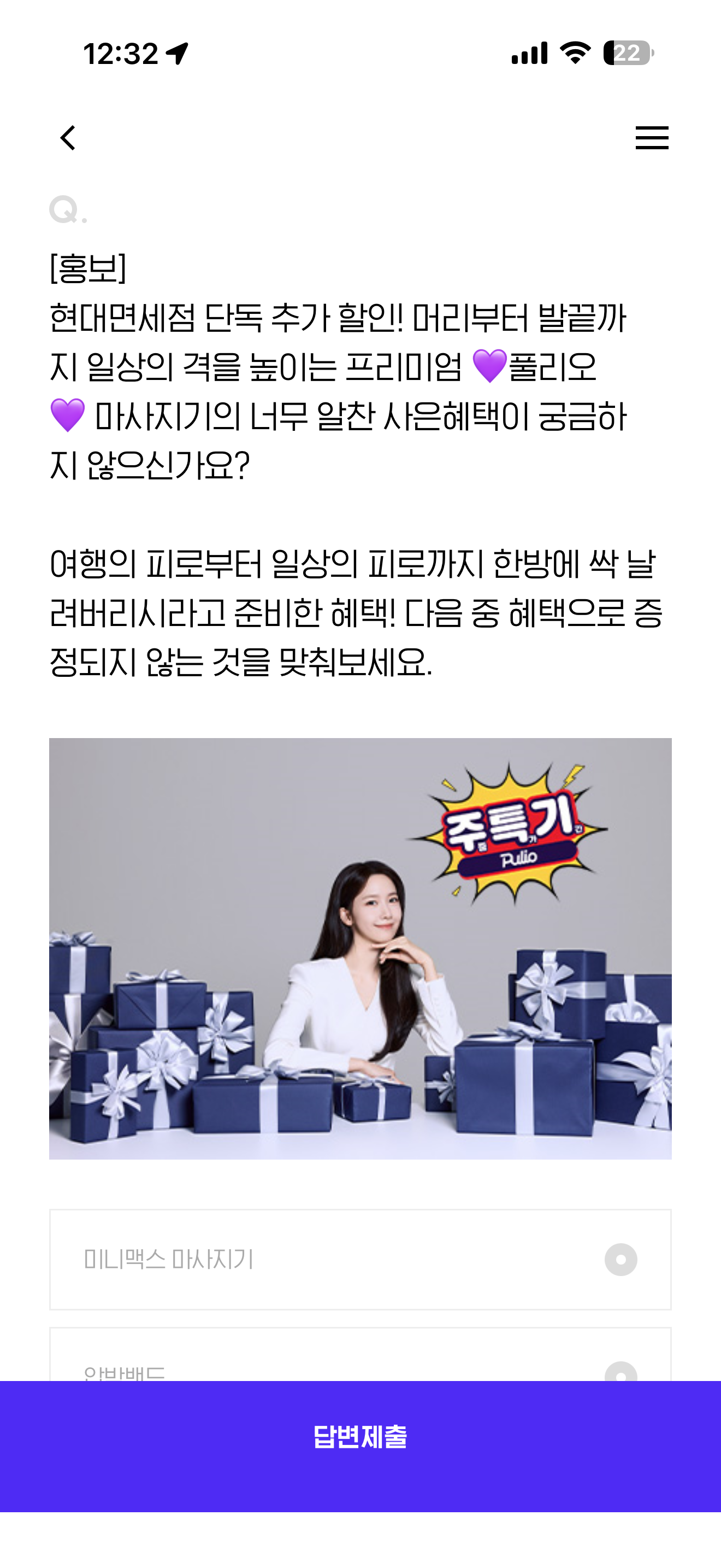 H포인트 퀴즈 11월 29일 정답(현대면세점 단독 추가 할인! 머리부터 발끝까지 일상의 격을 높이는 프리미엄 풀리오 마사지기의 너무 알찬 사은혜택이 궁금하지 않으신가요? 여행의 피로부터 일상의 피로까지 한방에 싹 날려버리시라고 준비한 혜택! 다음 중 혜택으로 증정되지 않는 것을 맞춰보세요)