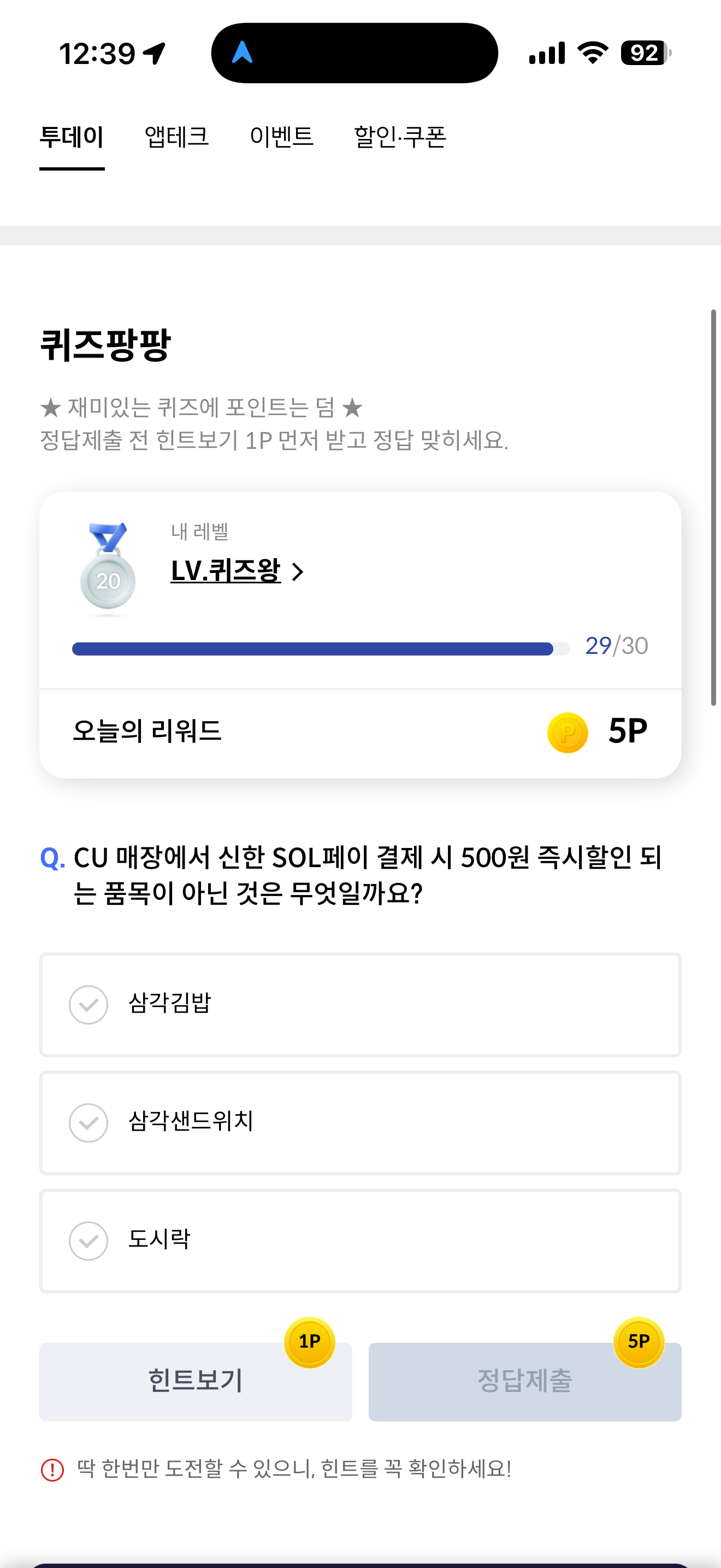 신한카드 퀴즈팡팡 11월 30일 정답(CU 매장에서 신한 SOL페이 결제 시 500원 즉시할인 되는 품목이 아닌 것은 무엇일까요?)